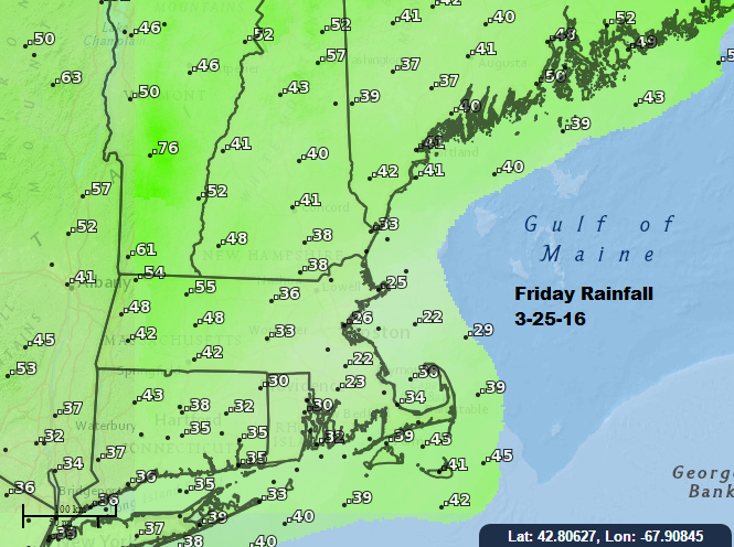 As the weather system moves north and east of our skies, things will clear and the weekend is looking quite nice. Saturday is seasonably cool with highs in the upper 40s, almost average for the day. Easter Sunday is the nicer of the two weekend days with highs rising above 50 degrees with light winds. There will be a sea breeze along the immediate coastline keeping it cooler there.