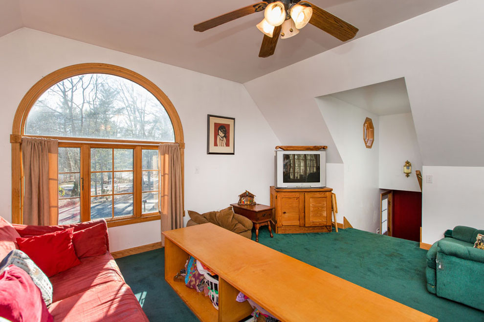 Down a few steps from the back-to-front mudroom, there’s an oversized, two-vehicle garage with workshop space. Up a few steps from the mudroom, above the garage, there’s a great bonus/family room that’s brightened by a Palladian window at the front, has a pair of ceiling fans, and a gas stove on a tile hearth, and measures just about 400 square feet.