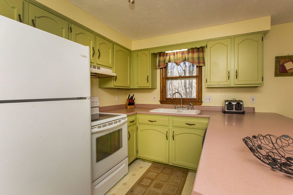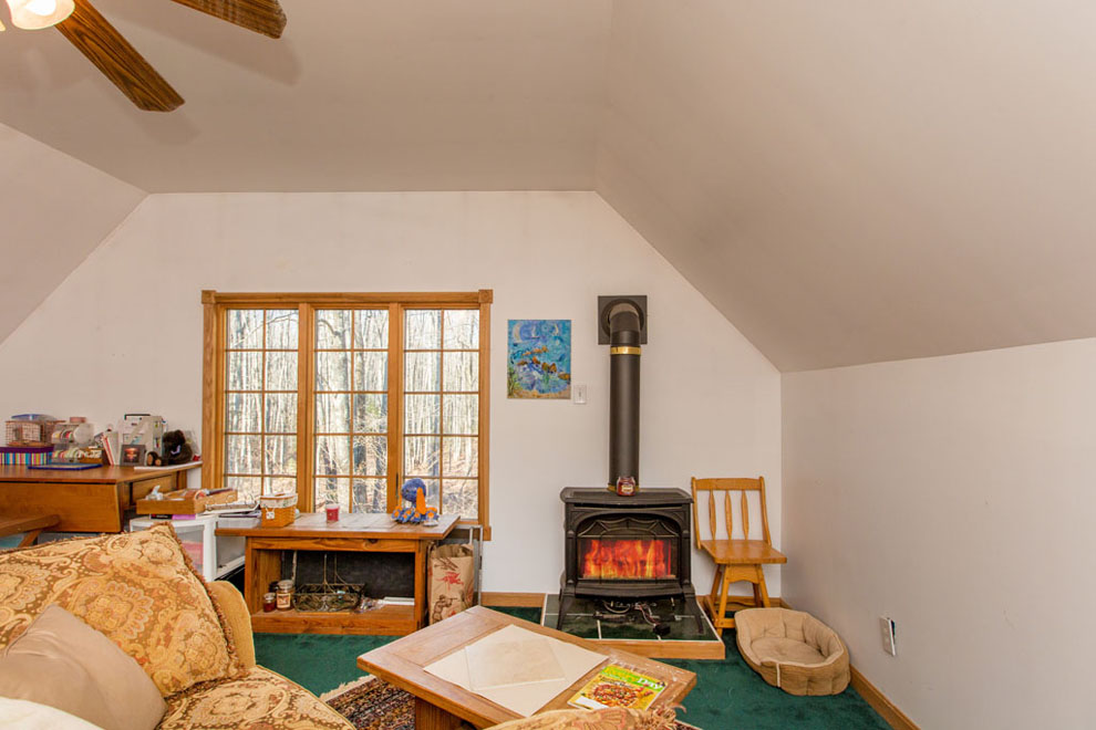 The main level is partially open-plan, with the eat-in kitchen flowing into the dining room, which shares the front of the house with the big living room. In addition to extra space for a table, the kitchen has a bar for seating. The oak-floored dining room has an antique Sears Roebuck woodstove on a brick hearth. A full bath with soaking tub is off the hall.