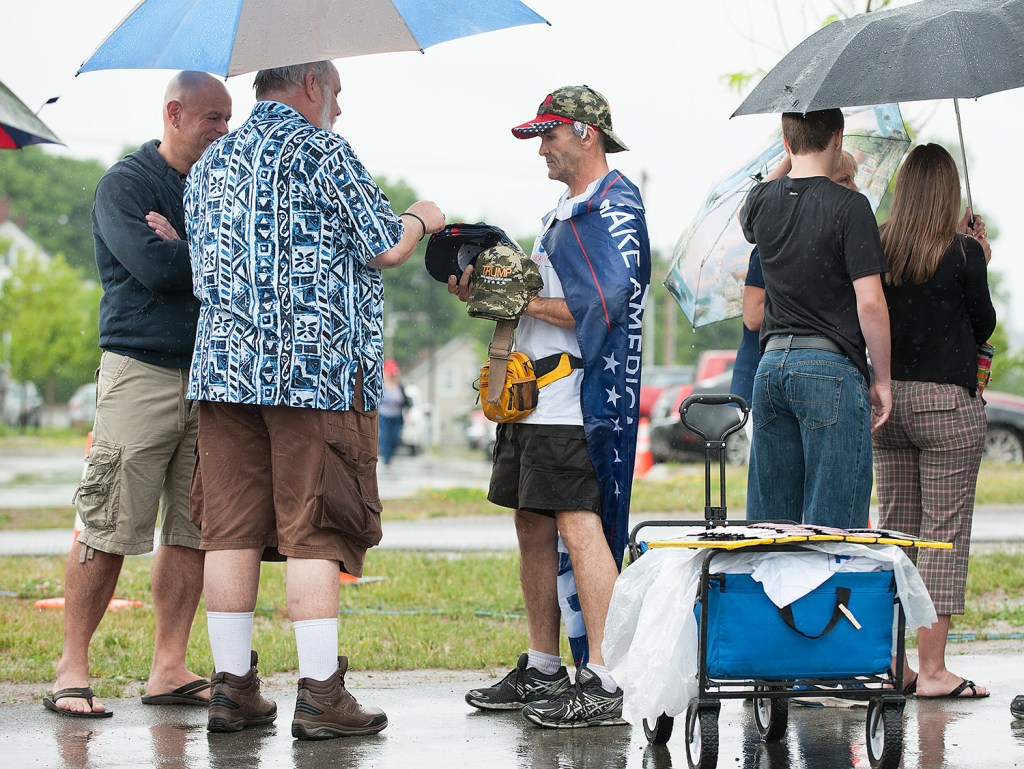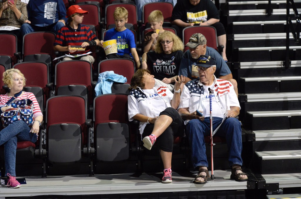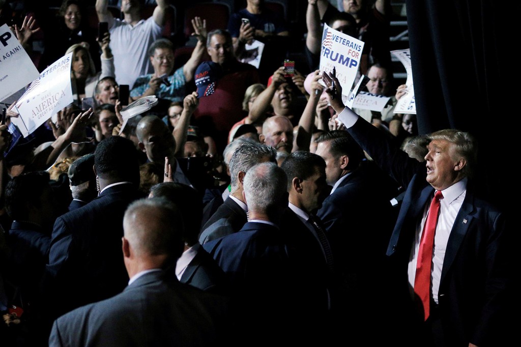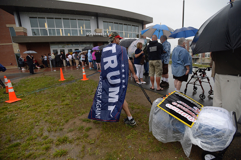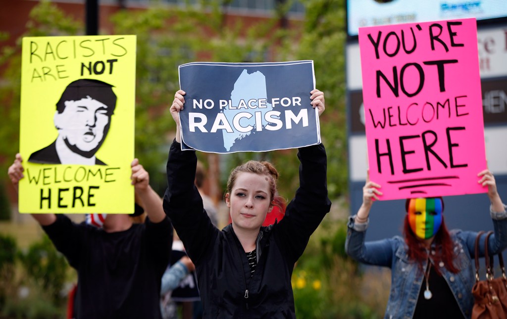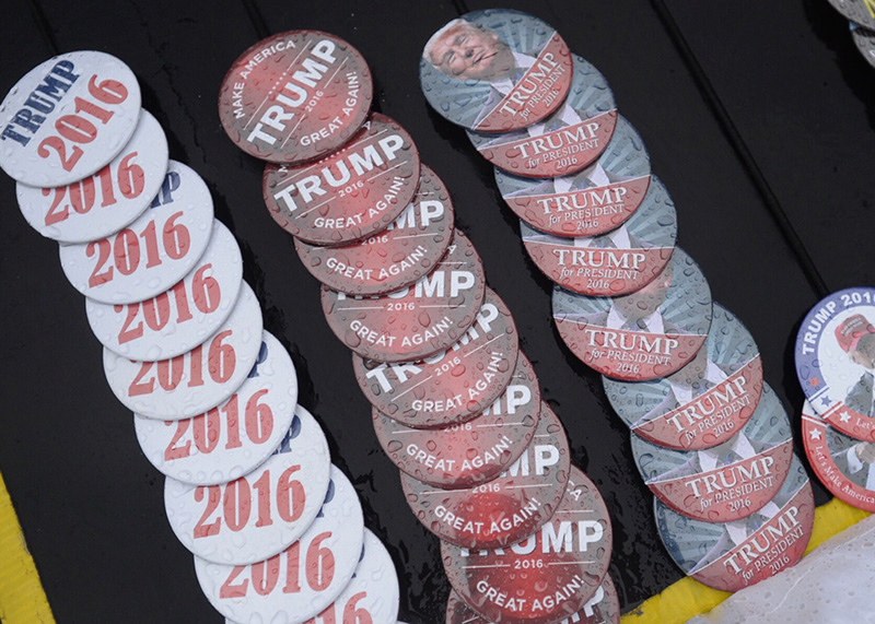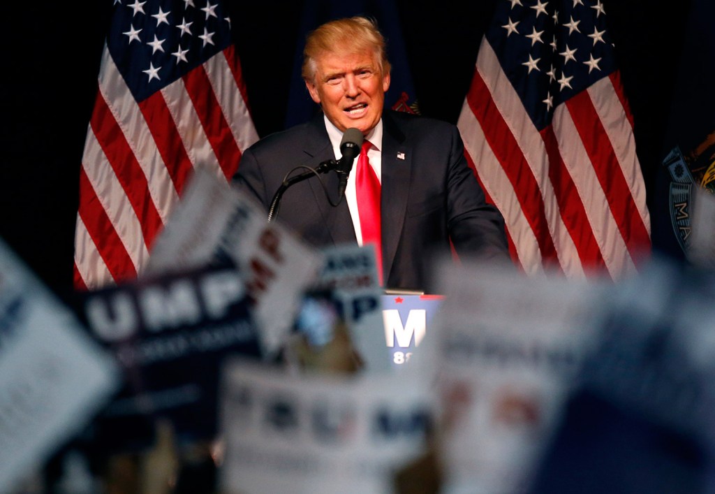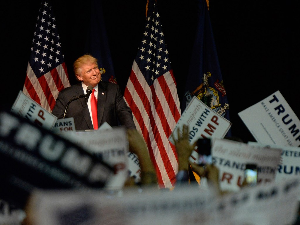Republican presidential candidate Donald Trump said at a rally Wednesday in Bangor, “Every country that we do business with looks at us as, we are the stupid people.” Robert F. Bukaty/Associated Press