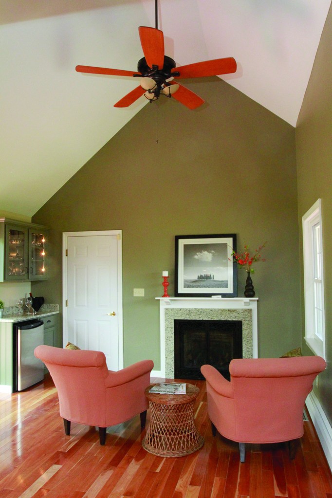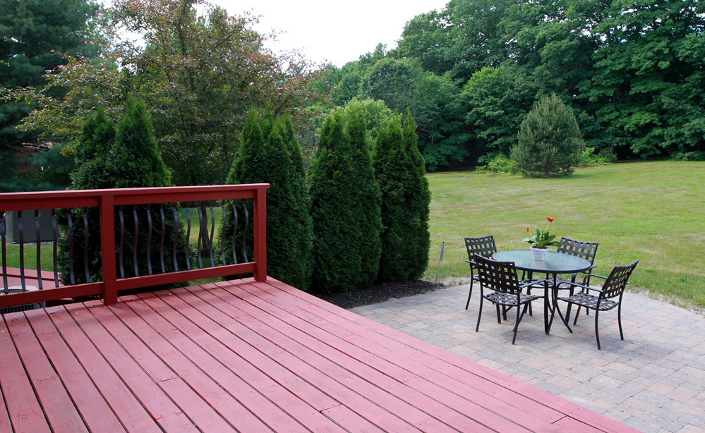 The three-year-“old” kitchen, especially, shines, with a GE Profile French door fridge among its stainless-and-black appliances, and granite surfaces including island with seating overhang. Cherry flooring extends into a charming, cathedral-ceiling sitting area with a fireplace and a corner bar; and into the pretty dinging room, which has beadboard wainscoting. Full-view doors open to a slightly elevated deck, 10 feet deep, with a patio just below.