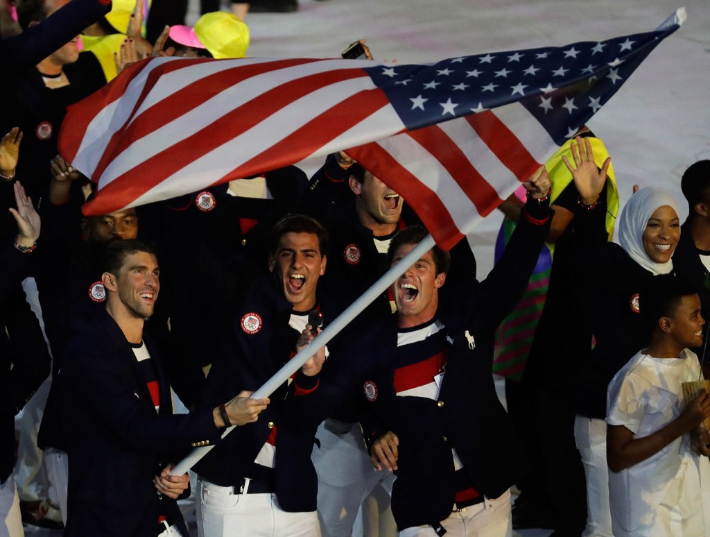 With “USA” emblazoned on the back of his jacket, Michael Phelps carried the flag for the U.S. team, the largest with 549 competitors. At his fifth and last Olympics, it was the first time the record holder of 22 medals had marched in an opening ceremony, having skipped previous ones to save energy for competition.