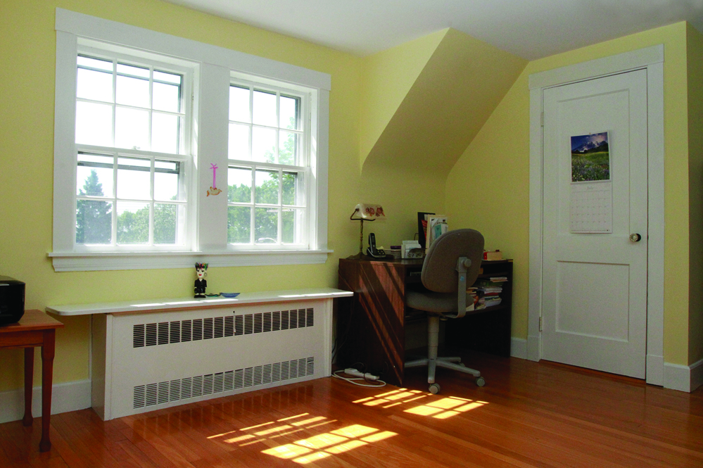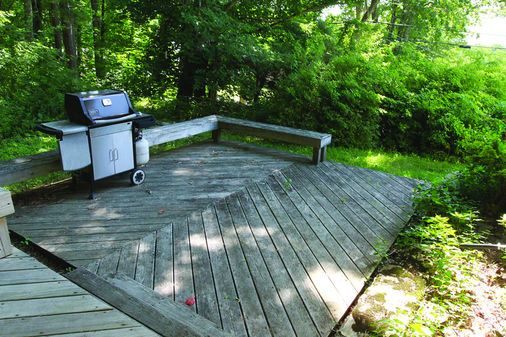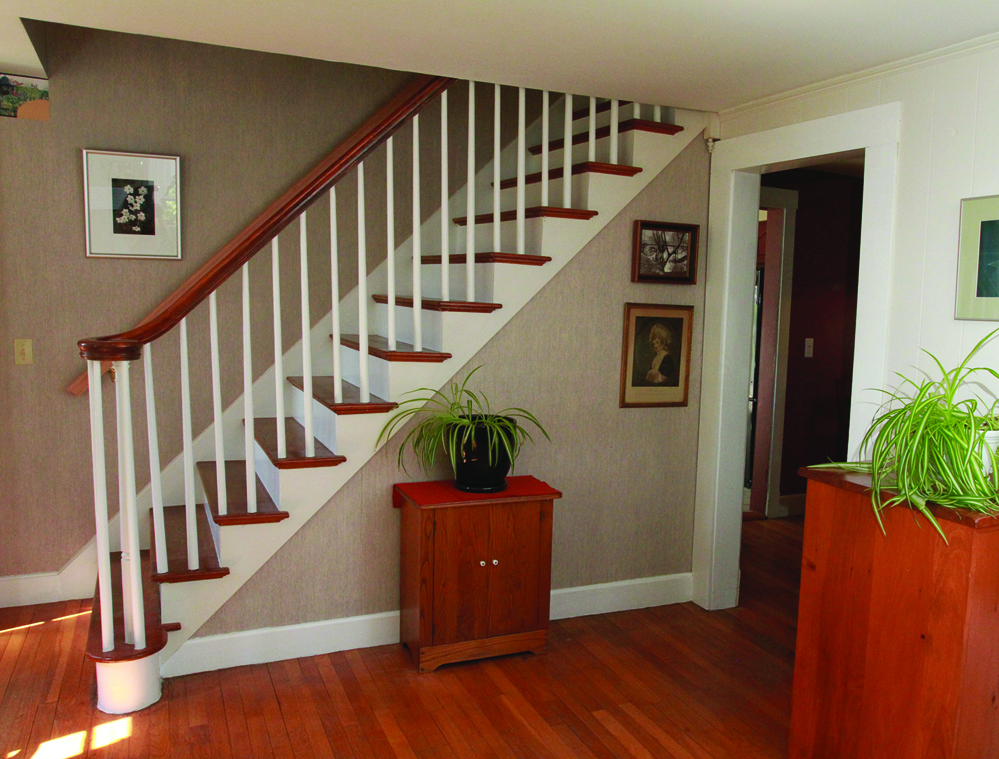 Expanded to 2,800 square feet, south-facing, and retaining plenty of vintage character, the home sits behind a pair of terraced stone walls, and vigorous gardens with potential for creating stunning perennial displays. Between sidelights, a handsome eight-panel front door opens into a long, oak-floored living room whose brick, wood-burning fireplace has a stunning dentil-molding mantel. To the rear, the two-section dining room has a beautiful built-in china closet, and opens out to a two-level deck with a hot tub and bench seating.