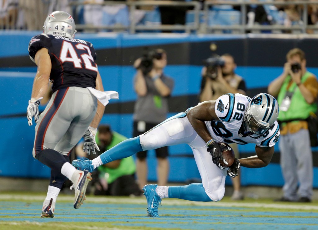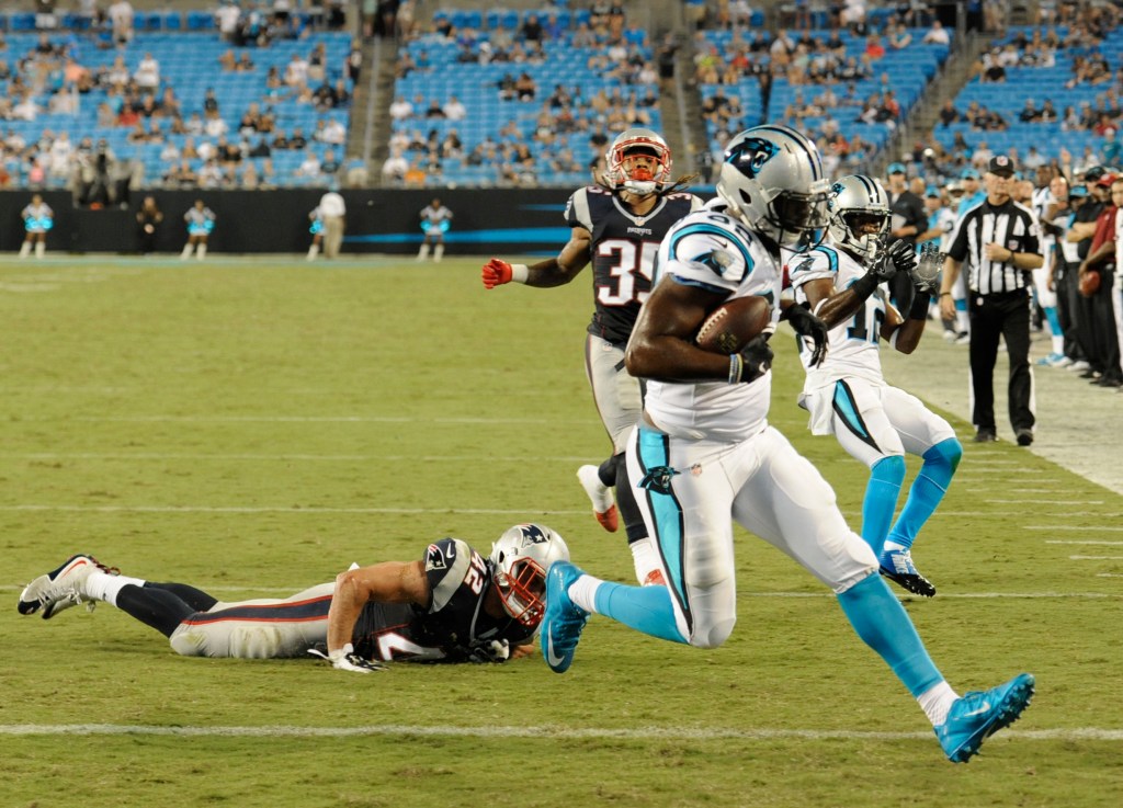 While Brady was on the mark, league MVP Cam Newton struggled mightily in his most extensive playing time of the preseason. Newton was intercepted twice and the Panthers failed to get any points on his eight first-half possessions. Overall, the Panthers scored just three points in 10 Newton-led drives.
