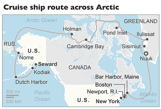 The Crystal Serenity began its voyage in Seward, Alaska, on Aug. 15, and reached Ilulissat, Greenland, on Sept. 6. It will make a port of call in Bar Harbor on Sept. 12 en route to its final destination of New York City on Sept. 16. Associated Press map with information from Crystal Cruises