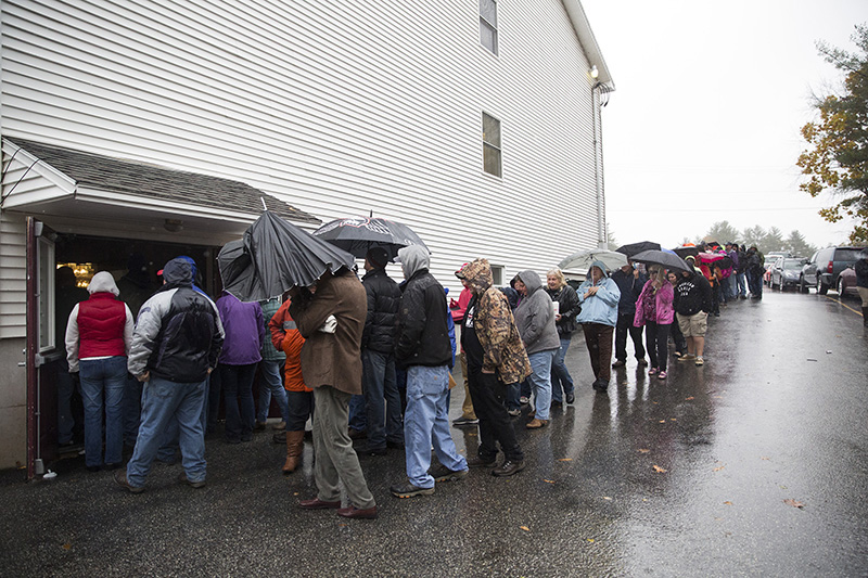 Supporters began lining up before noon, many of them holding umbrellas to shield them from a cold and driving rain. Many were excited that the New York businessman-turned-politician was paying so much attention to Maine this late in the election cycle.