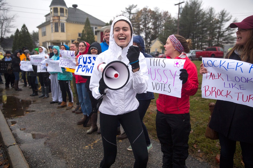 Meghan Lynch, 21, a Bates student who organized the protest, said Trump has engaged in sexual misconduct, and he had belittled those offense with his actions and words. “As college students, we think that is not something to be belittled, and we’re here to resist the rape culture that Trump has been perpetuating,” she said.