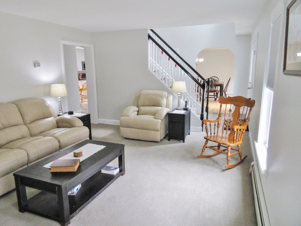 To take a few examples, the dining room has a new, maple floor and double tray ceiling. The interior is freshly painted. The back deck is rebuilt and re-railed. All exterior doors are new. The living room’s corner pellet stove is a boon to overall efficiency.