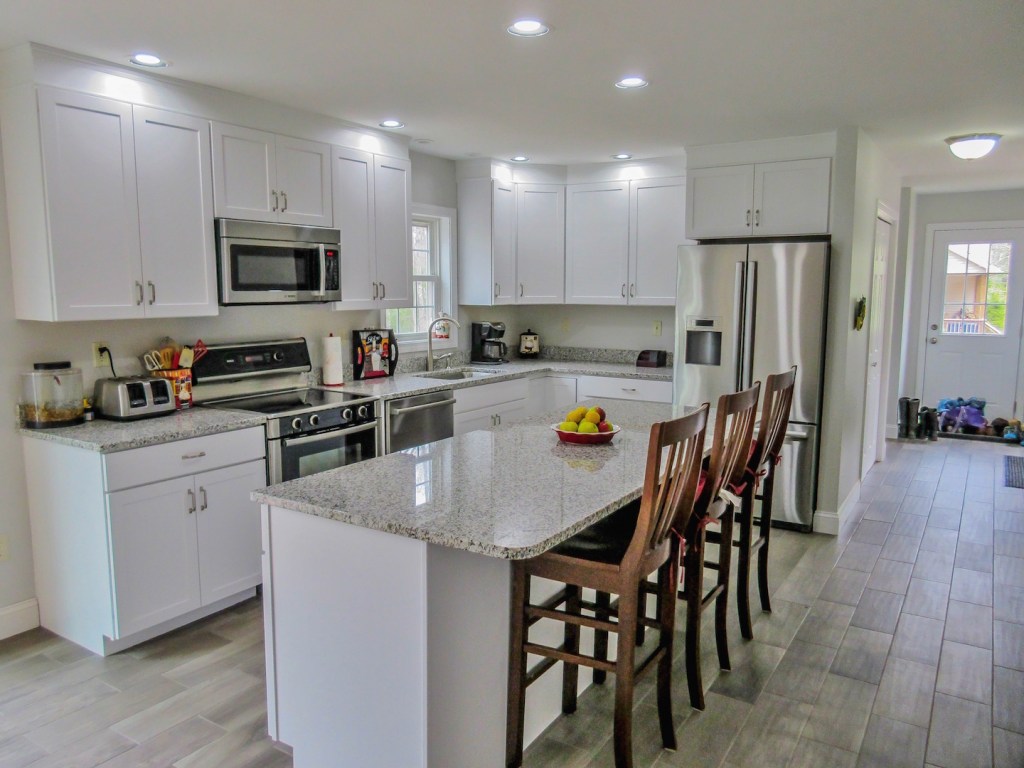 The highlight of the renovations is undoubtedly the custom kitchen, with its 36-inch, ceiling-high cabinets, stainless appliances including French door refrigerator, granite counters and island, and textured, plank-style ceramic tile.