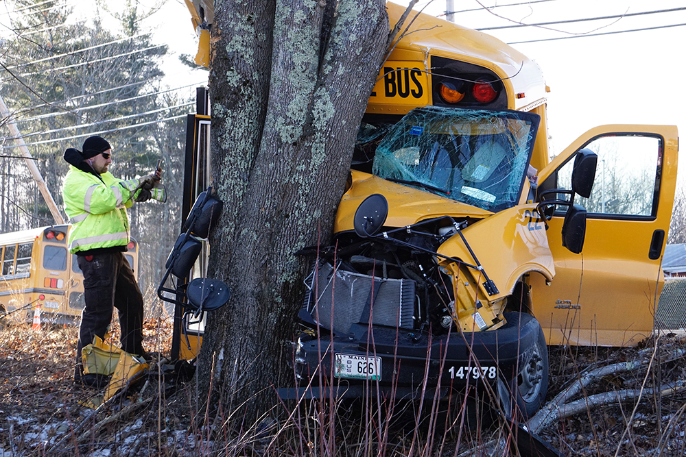 A school bus carrying three elementary school students crashed head-on into a tree Monday morning in Sanford.