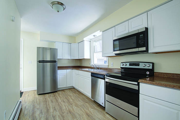 In the galley kitchen, stainless-and-black appliances – Amana stove and micro, Whirlpool refrigerator and dishwasher, are new.
