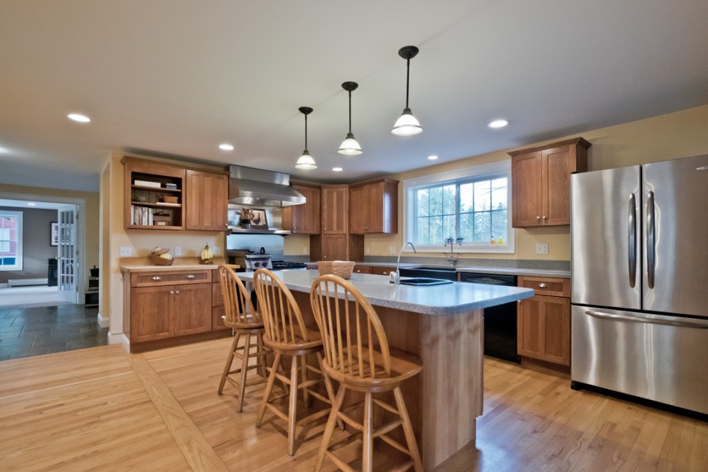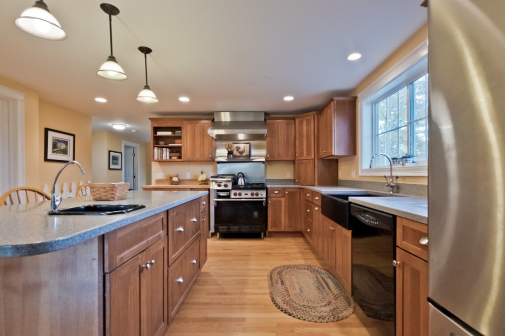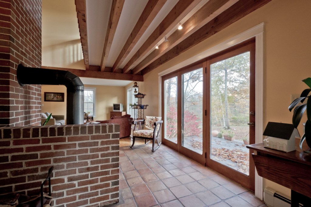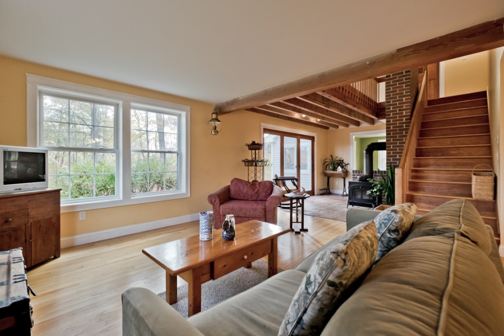 Off the tiled, two-section mudroom, there’s a front-to-back family room one one side; on the other, the heart of the open-plan main level: a gem of a chef’s kitchen, whose stainless appliances include a Wolf gas range with four burners and an elevated griddle, and a Maytag French door refrigerator. Counters are Corian, floors oak, ceiling beams exposed, here and above the adjacent double living room with a wood stove on a brick hearth.