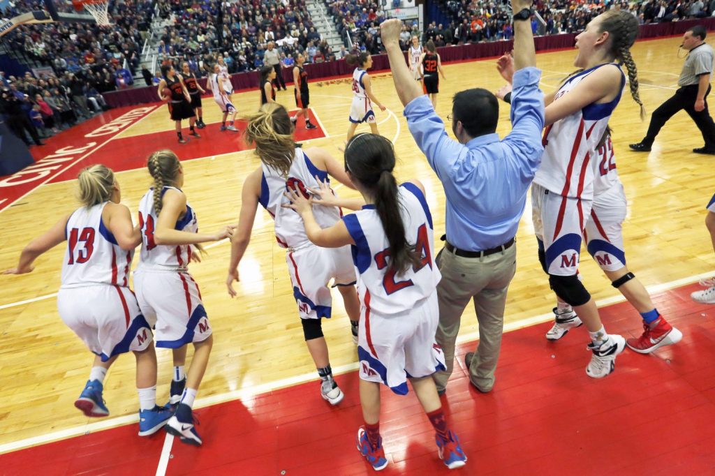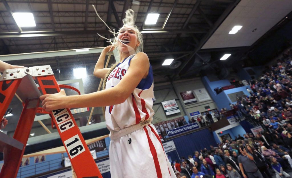 All that was left was the celebration, which began with 1:41 remaining when Derosby began taking his starters out. Holmes, who finished her career with over 1,400 points, came out with 1:03 left and leaped into Derosby’s arms before everyone else came in for a jubilant group hug.