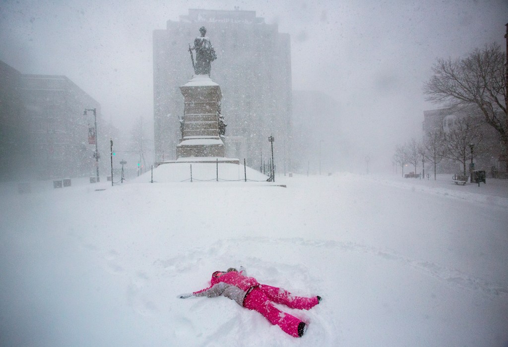 Few people were on the streets as the snow arrived, but one woman took advantage of the quiet downtown to meditate in Monument Square.