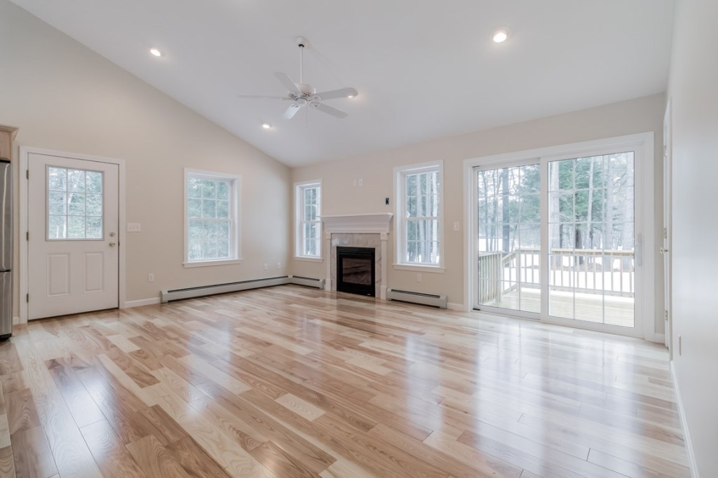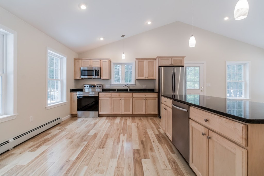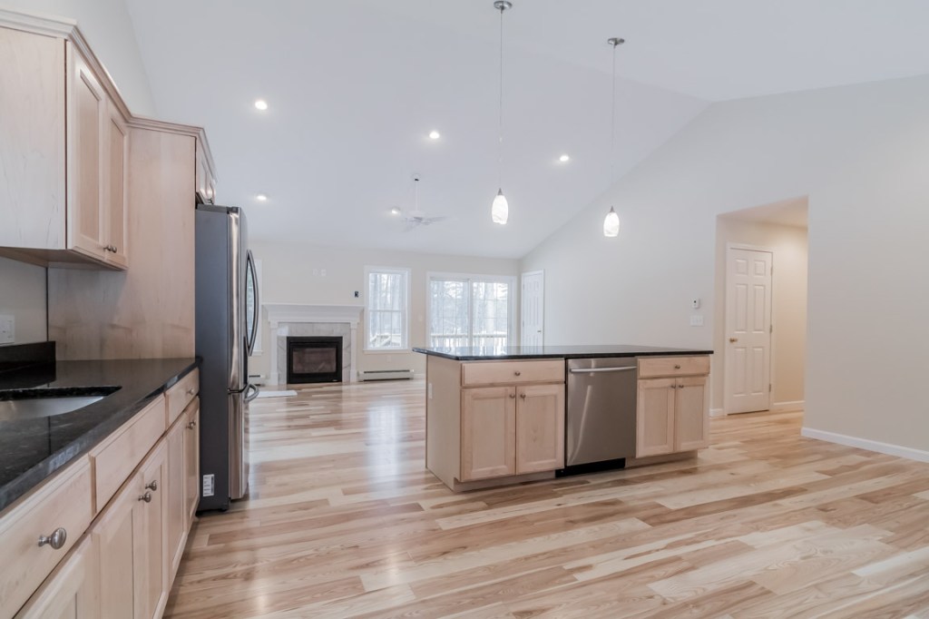 The heart of the home is a huge, open-concept great room with a cathedral ceiling. An 8-foot, granite island subtly divides dining and living areas, but the space is flexible enough to allow for different dining areas, for example. The kitchen has stainless-and-black appliances, birch cabinetry, and pretty pendant lights over the island and the undermount sink.