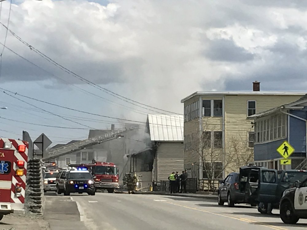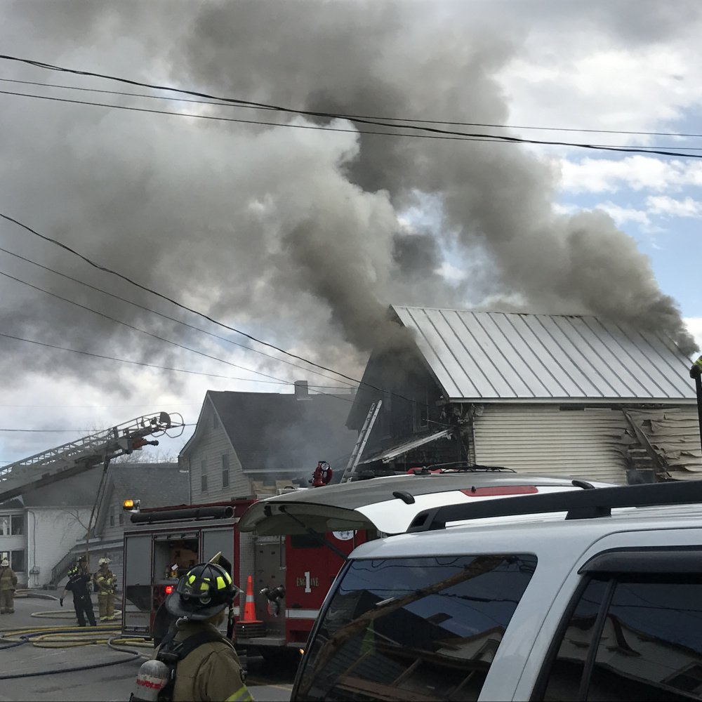 The fire, which was reported about 3 p.m., prompted officials to shut down the busy street for about three and a half hours as more than two dozen firefighters from Augusta, Winthrop, Chelsea, Togus, and Gardiner battled the blaze. None of the six people living in building was injured, though one pet reportedly died in the fire.