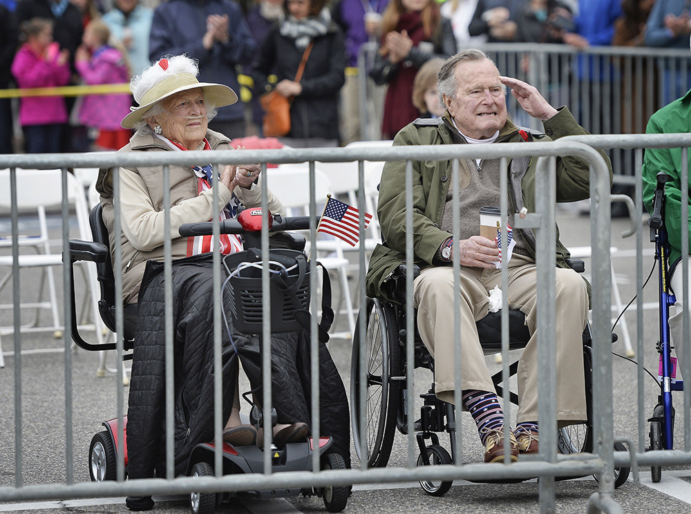 There to greet them was former President George H.W. Bush and his wife, Barbara, who sat in a cordoned off area in Dock Square, waving to paradegoers and marchers as they passed by.