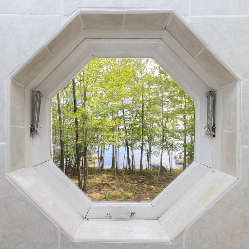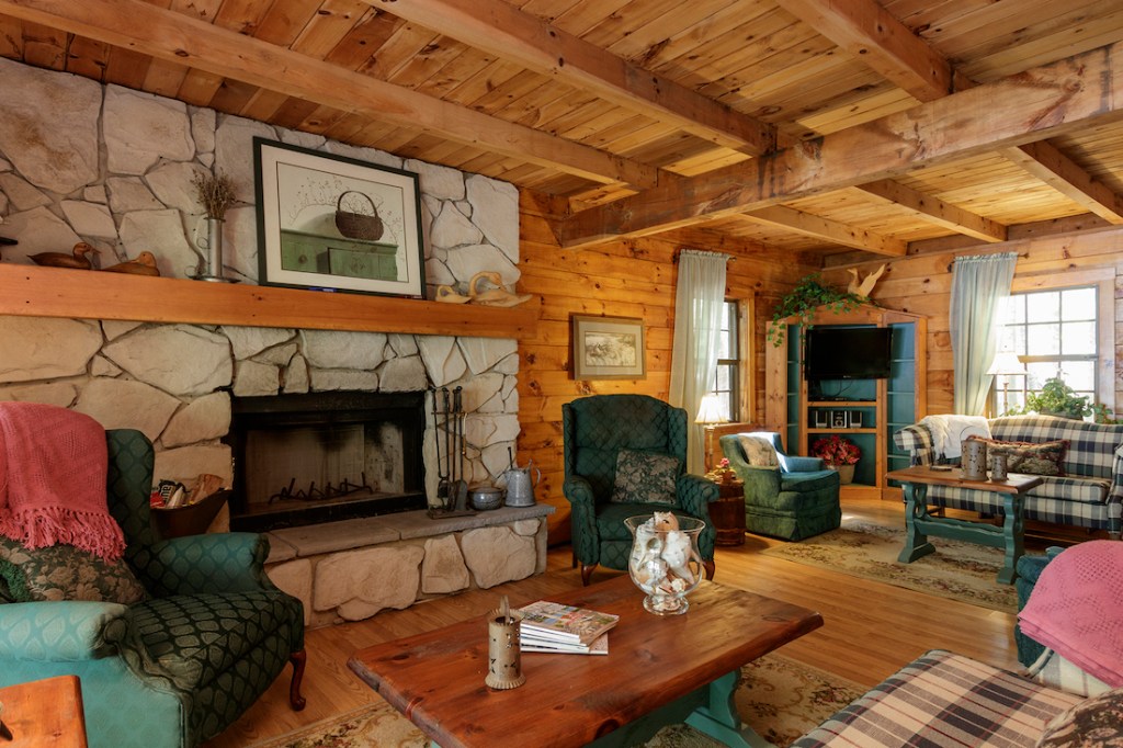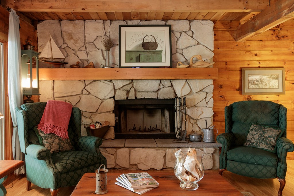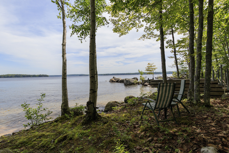 From the open-concept first-floor interior, a row of tall windows ushers in lake views. This level is pine-paneled, classic Maine-cottage fashion, and features a floor-to-ceiling stone, wood-burning fireplace that is the home’s heat source. The dine-in kitchen’s appliances are newer, and there’s a daylight/lake-view laundry/powder room adjacent.