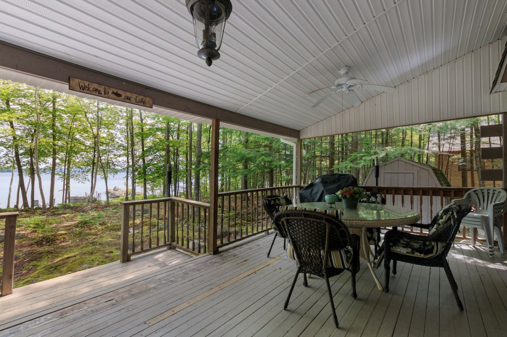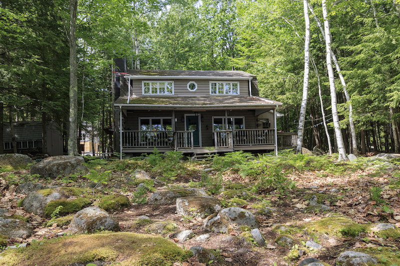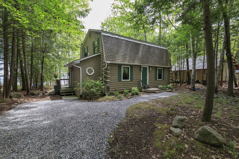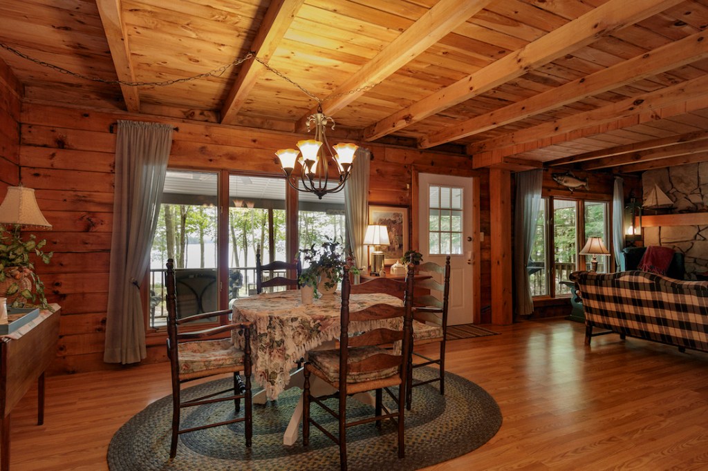 This property, a 1985 cottage gambrel of character, has its own, east-facing sandy beach, 76 feet of frontage tucked between two lines of privacy-enhancing boulders. The level, 0.40-acre lot’s natural landscaping is very pretty indeed. A 16-foot-deep covered porch overlooks the water. The dock is on the shore, ready for a new owner to put in.