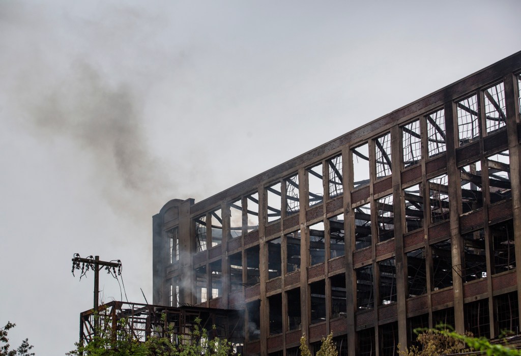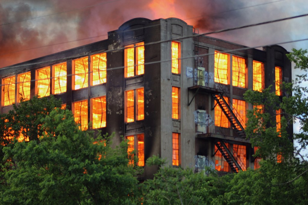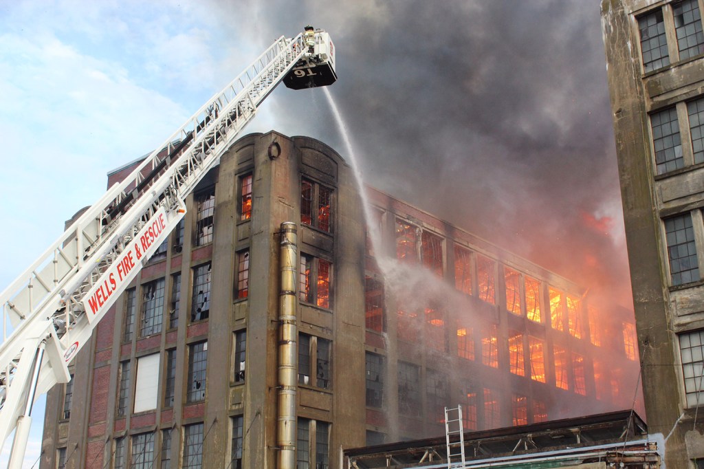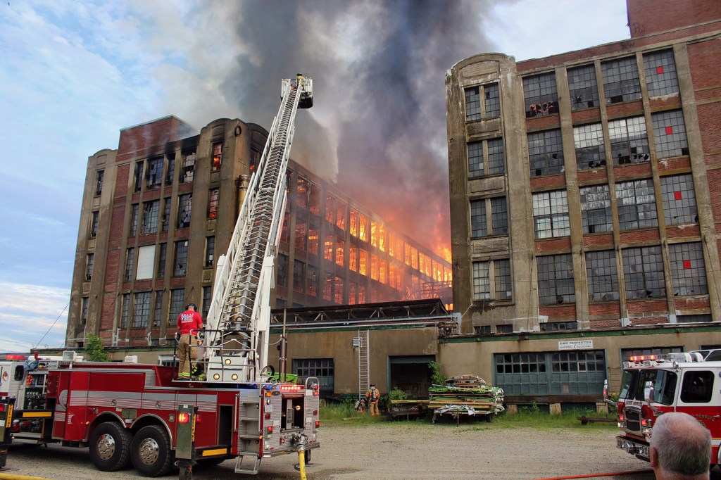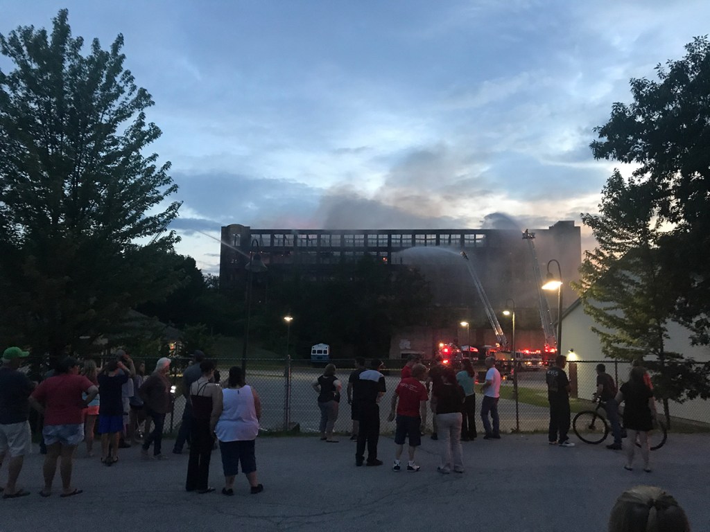 The fire at the building, known locally as the Stenton Trust Mill, was reported about 6:50 p.m. and spread quickly, with flames leaping from the windows and smoke filling downtown.