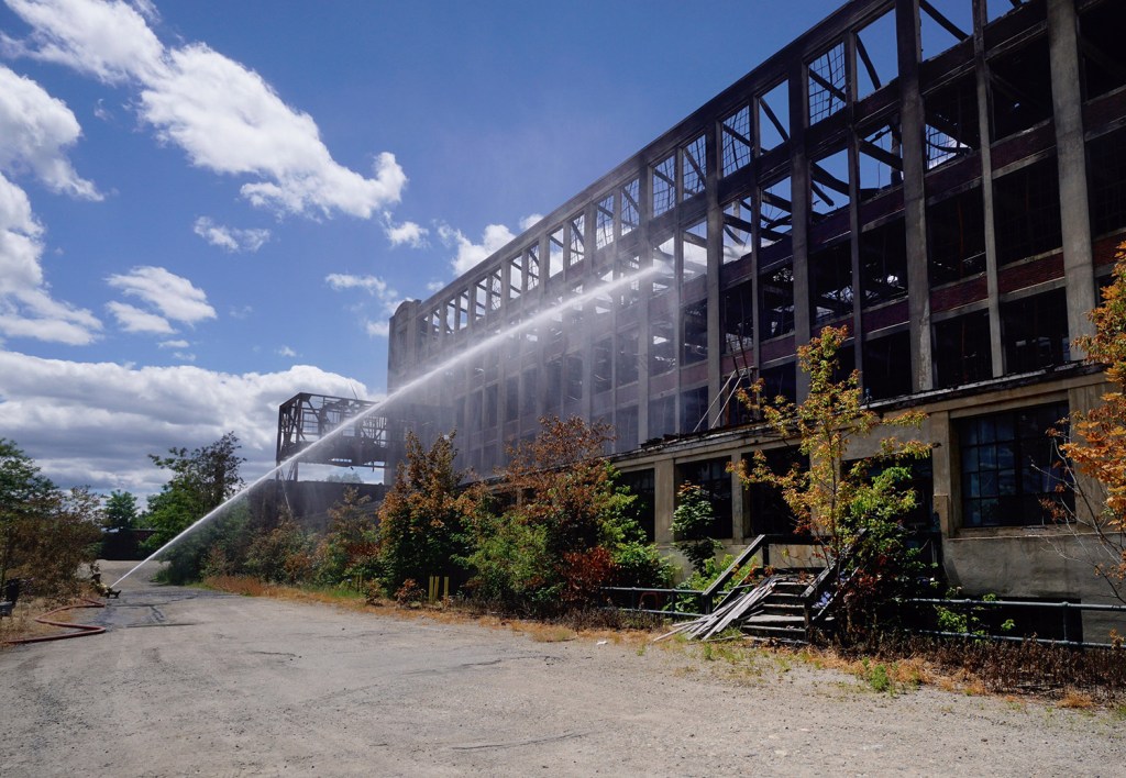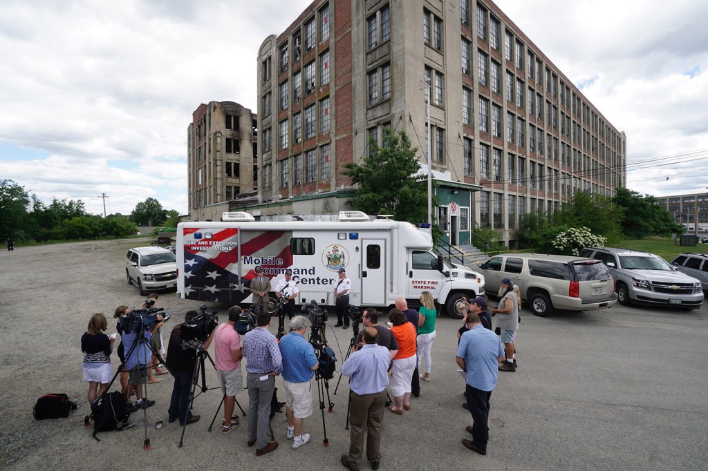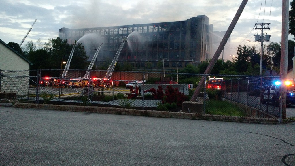 One of the mill’s walls was bowing, and firefighters were concerned that it might collapse. They planned to be on the scene all night, hosing the mill with water from ladder trucks. They also were concerned the fire might spread to an adjacent mill building, which also was vacant, and planned to use a drone to look for hot spots.