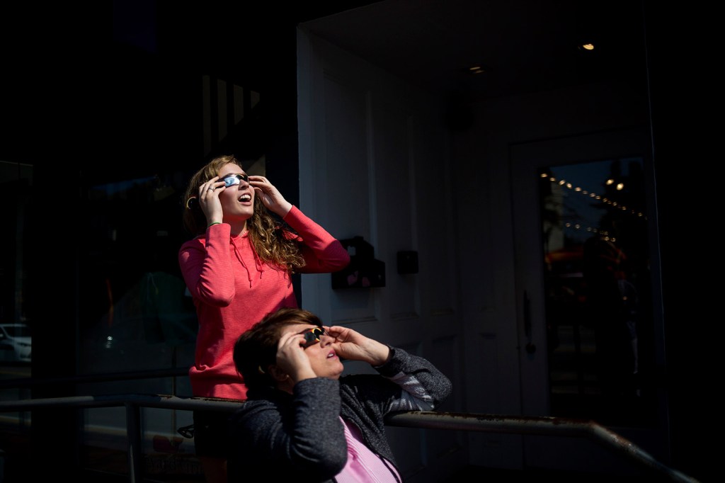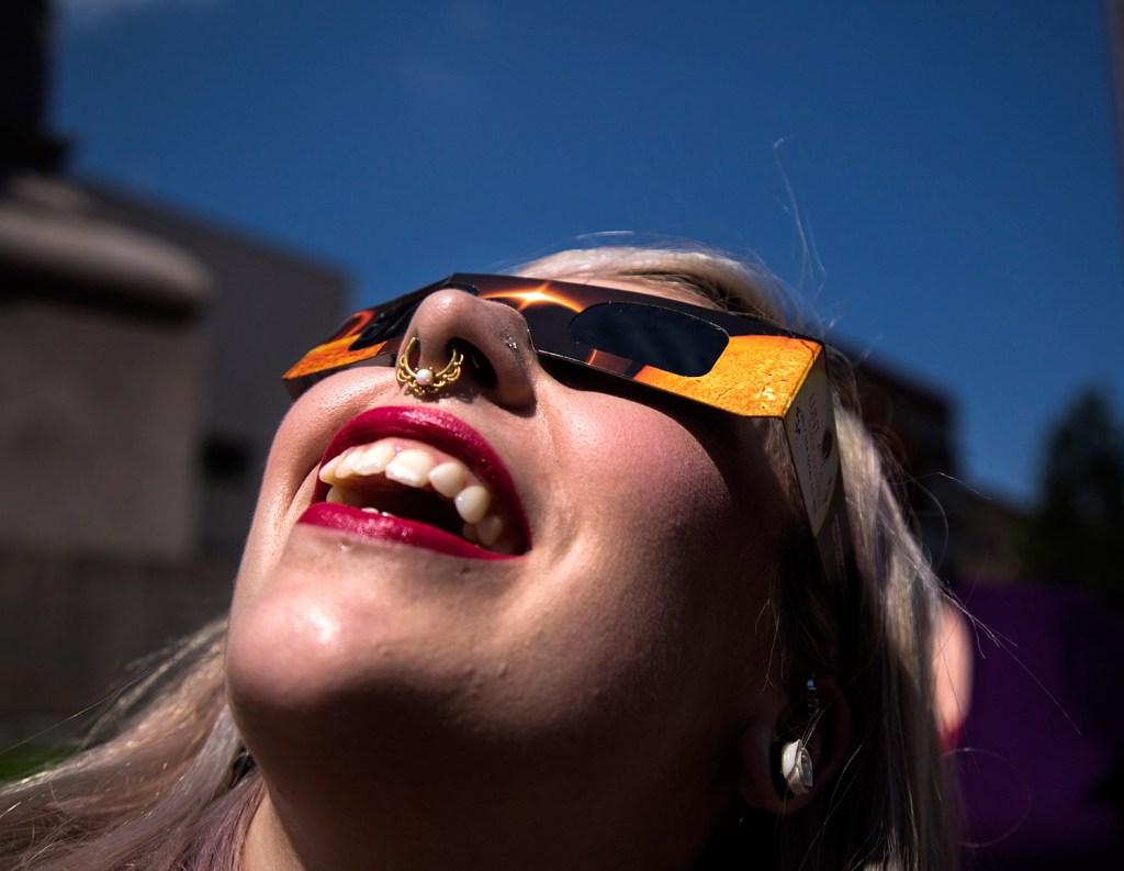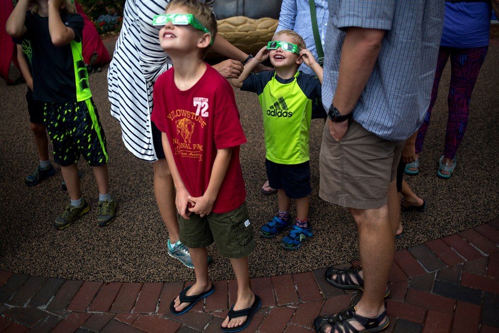 As the moon covered more of the sun, a diverse crowd grew in Portland’s Monument Square. Many shared their glasses and viewing equipment. Someone lent glasses to 7-year-old Emmett Brady.