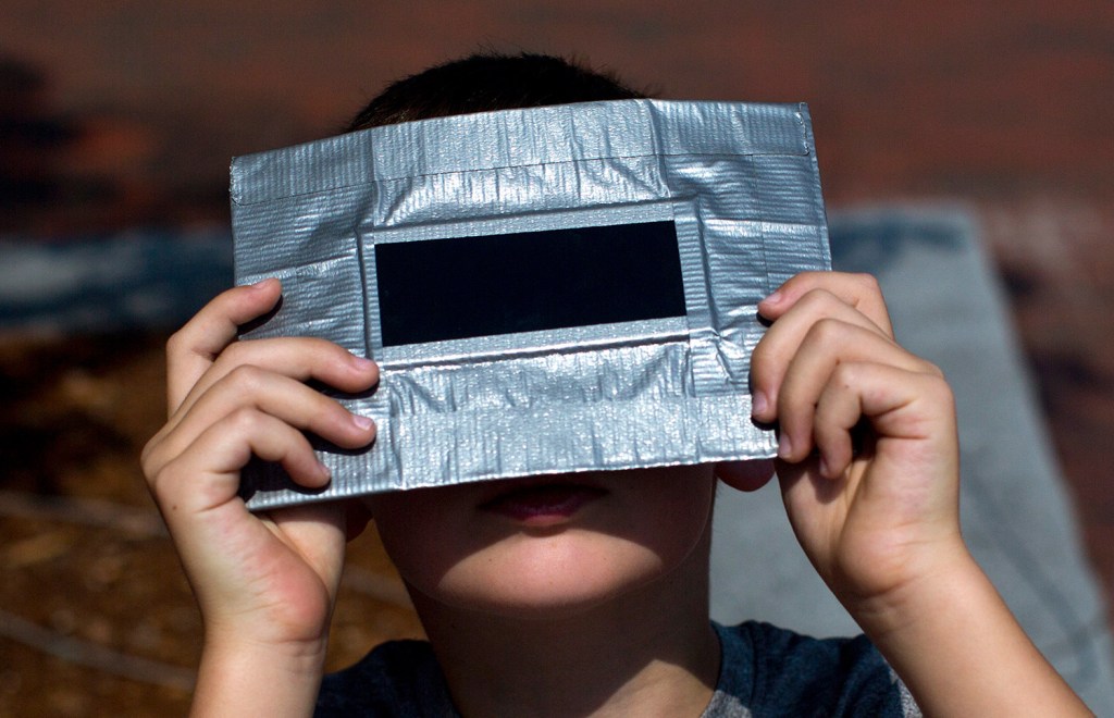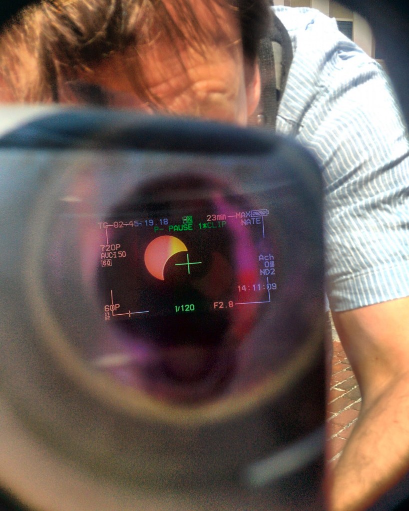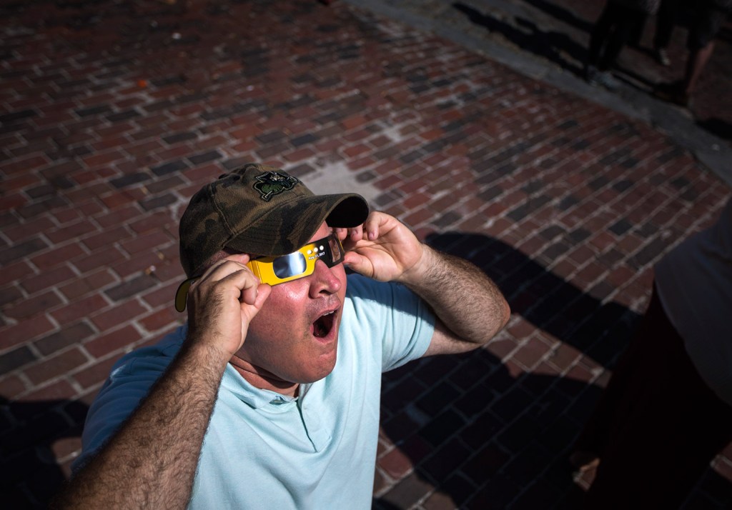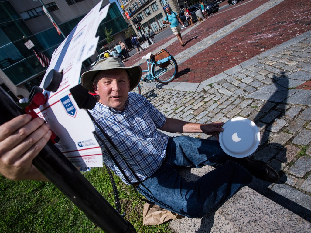 Some brought makeshift pinhole cameras made out of cardboard boxes and aluminum foil that got mixed reviews. But many in Monument Square agreed that Nate Morse, a 56-year-old amateur astronomer from Yarmouth, had the best rig.
