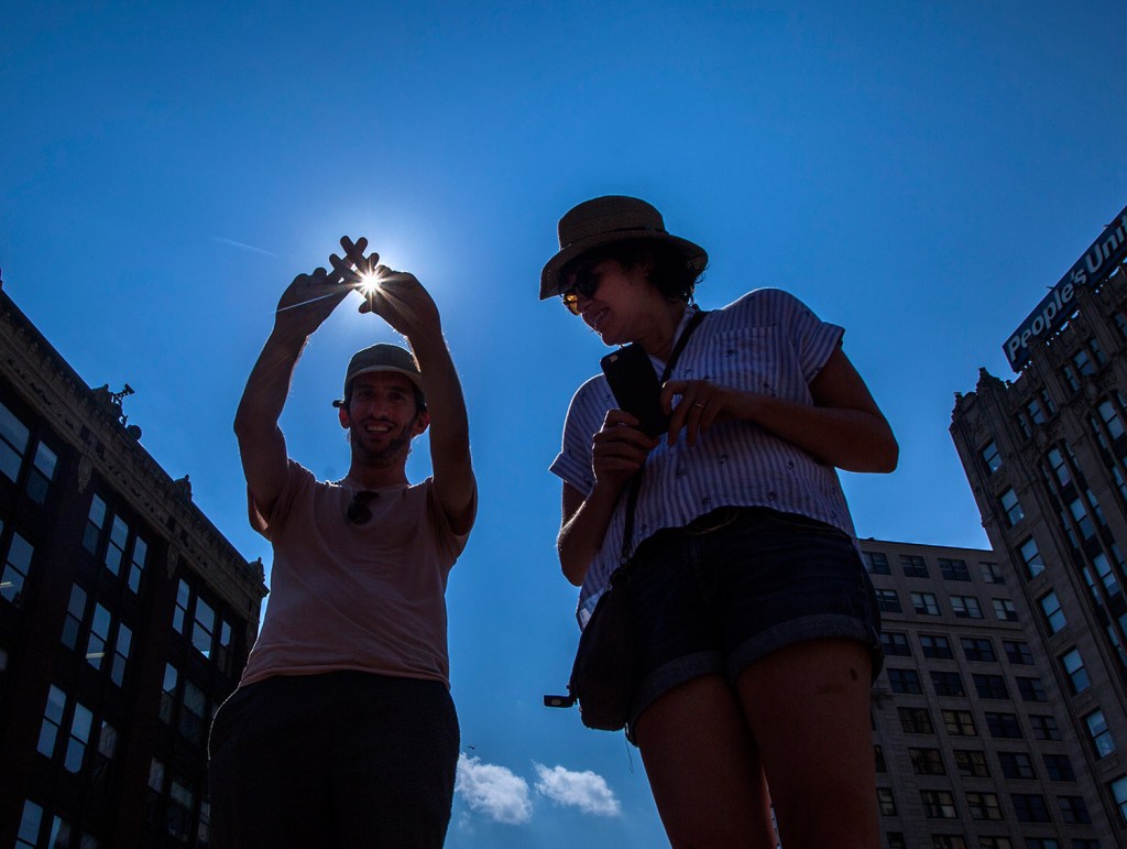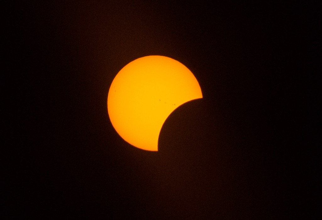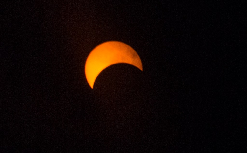 The crowd in the square let out a cheer at 2:45 p.m., when the eclipse peaked at 58.8 percent coverage. A crescent of the sun still shone through and it didn’t seem noticeably darker outdoors.