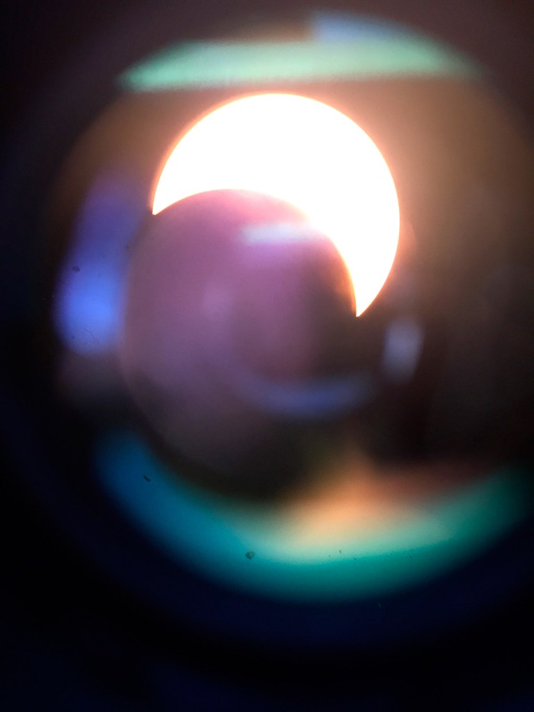 Hundreds gathered at L.L. Bean’s headquarters in Freeport to view the eclipse through six large telescopes that were set up in front of the company’s giant “Bean Boot” statue. A flat-screen TV also was set up outside to live-stream NASA footage of the eclipse. Others watched the event using paper plates with pinholes poked into them or through disposable, solar-filtered glasses.