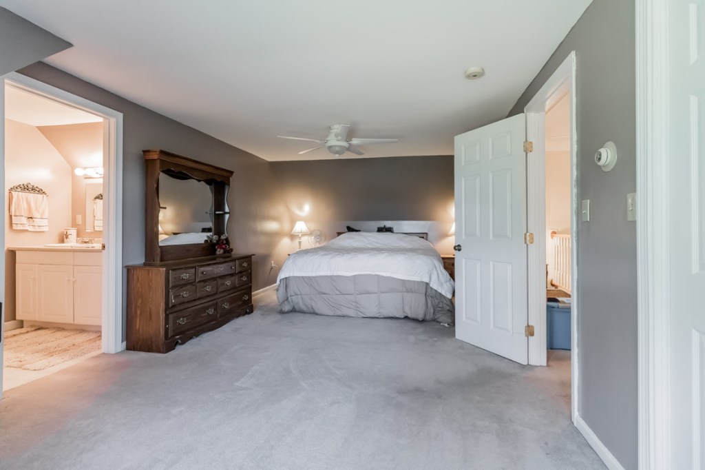 A big mud room with a powder room and laundry in an enclosure completes the first floor. Upstairs, the well-appointed master suite occupies the east wing; across the carpeted landing/sitting area are two large bedrooms, back and front, and a full bath to serve them.