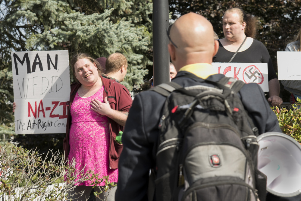 The closest thing to a confrontation happened after the counterprotesters arrived at the main rally, and one of the man rally’s speakers, Samson Racioppi, approached the row of bushes where they were standing.