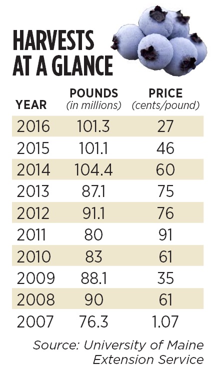 Preliminary industry figures show the crop coming in at about 65 million pounds, Wild Blueberry Commission of Maine Executive Director Nancy McBrady said. It’s more than enough for the state to remain far and away the wild blueberry capital of the country, but a sharp drop from recent years when the size of the crop soared and the price to farmers dwindled.