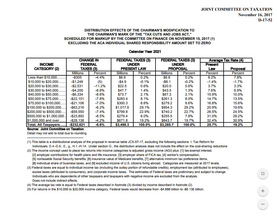 Similarly, the Joint Committee on Taxation’s analysis of the Tax Cuts and Jobs Act claims that the repeal of the Obamacare individual mandate will cause taxpayers earning between $10,000 and $30,000 to face a tax increase starting in 2021. Under this assumption, millions choose not to purchase Obamacare, meaning they will also choose not to receive the Obamacare refundable tax credit.