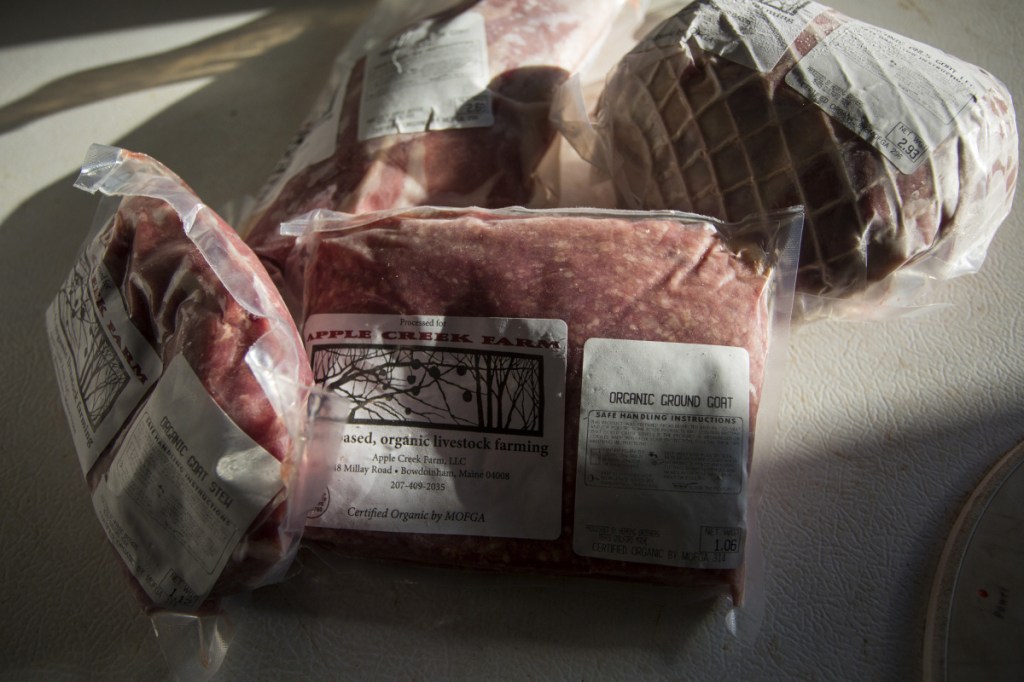 “Goat is a precious commodity in our house,” said farmer Abby Sadauckas, who raises cashmere meat goats at Apple Creek Farm in Bowdoinham. Apple Creek Farm is the only vendor selling goat meat at the Brunswick Winter Market, and Sadauckas expects to sell out all of her meat from this year’s crop of “bucklings” (her young male goats, which typically are about 18 months when slaughtered; she keeps the does to breed) by March 1. “We don’t get to eat a lot of lamb and goat anymore because it sells really quickly.”