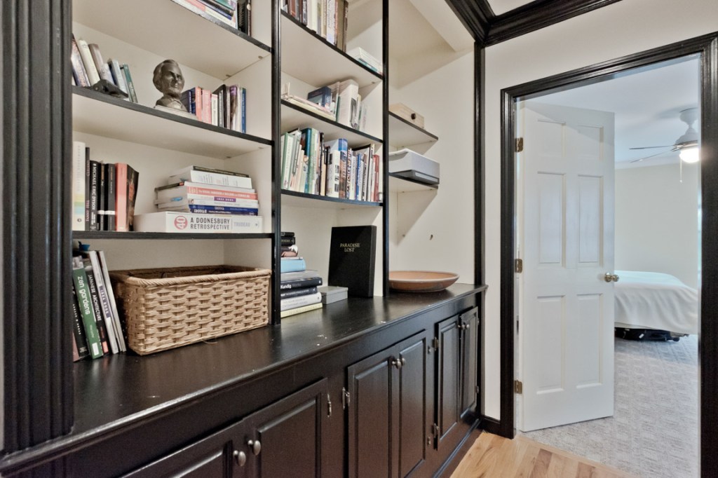 On the second story, in addition to a full bath and three good-sized bedrooms (two of the bedrooms have window seats, as does the center hall) is a huge haven of a double office that has a half-bath, a library’s worth of shelving, and a sitting/work area whose built-in desk has map drawers.