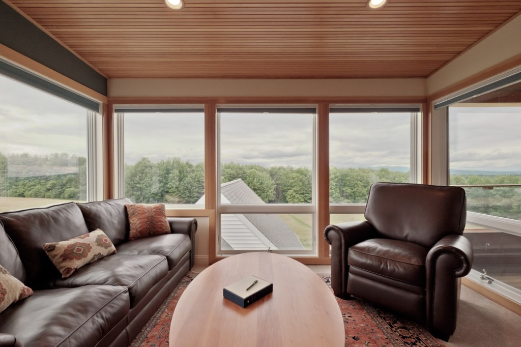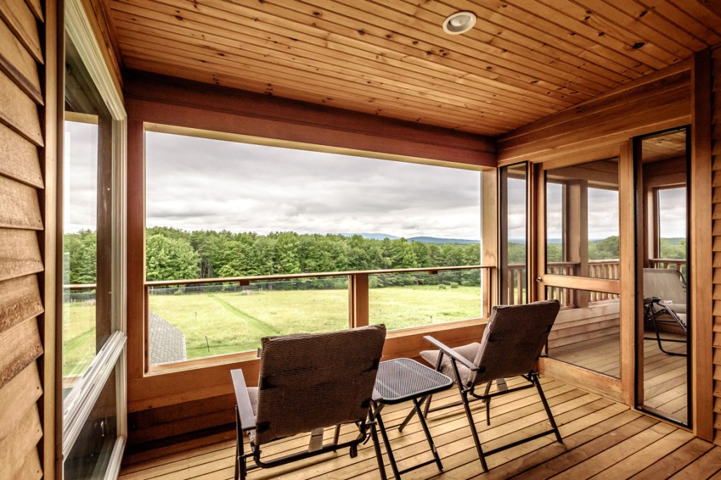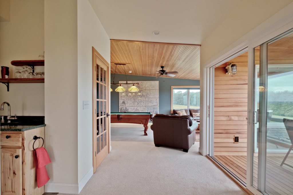 The new “Skybox” third level offers these majestic prospects and is almost a home in itself. There’s a sweetly aromatic, pine-paneled ceiling bedroom; a sitting area/game room, with billiards table; a covered porch, a kitchenette, and a half-bath.