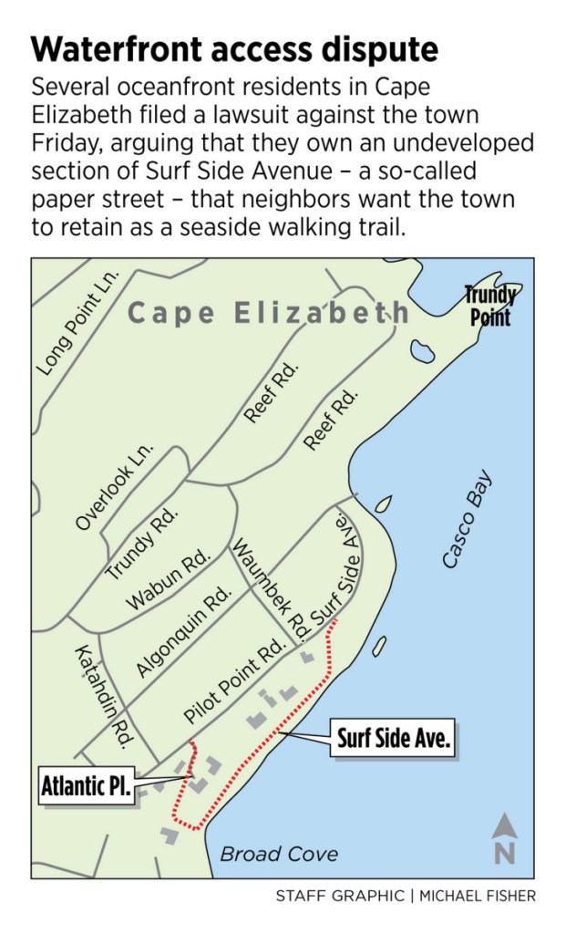 Several waterfront residents in Cape Elizabeth filed a lawsuit against the town Friday – one week before town officials plan to hold facilitated community meetings in the hope of resolving a heated neighborhood dispute over so-called paper streets and seaside public access.