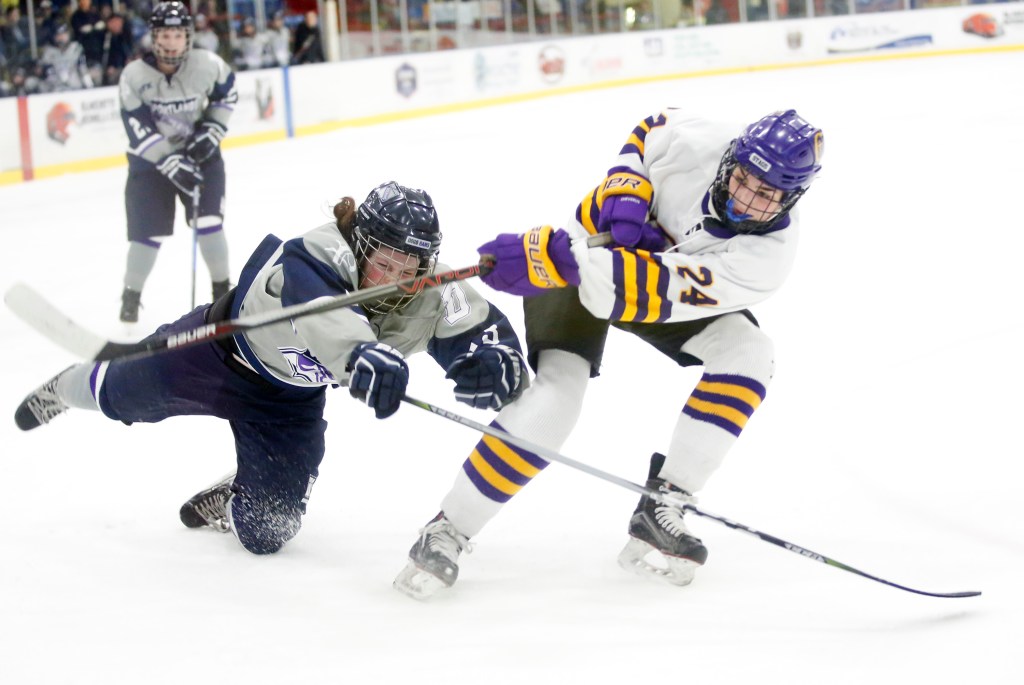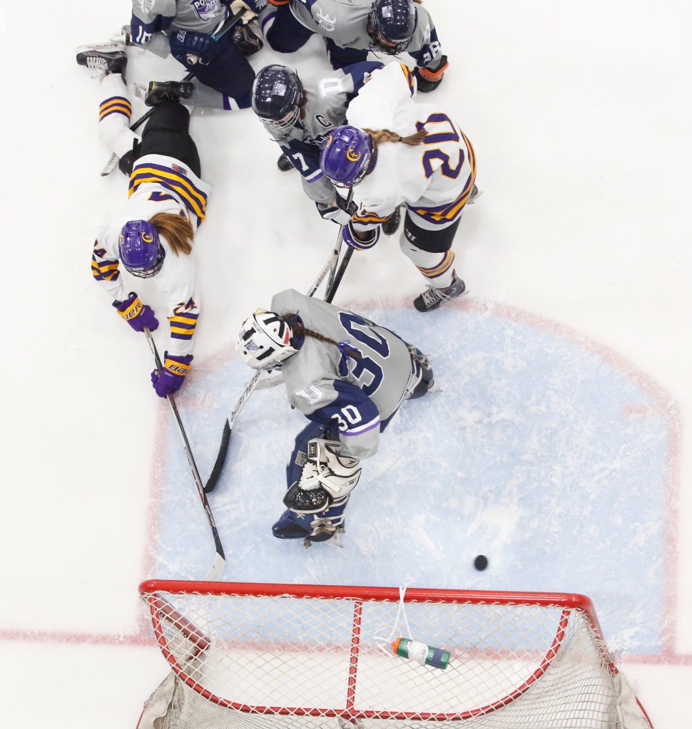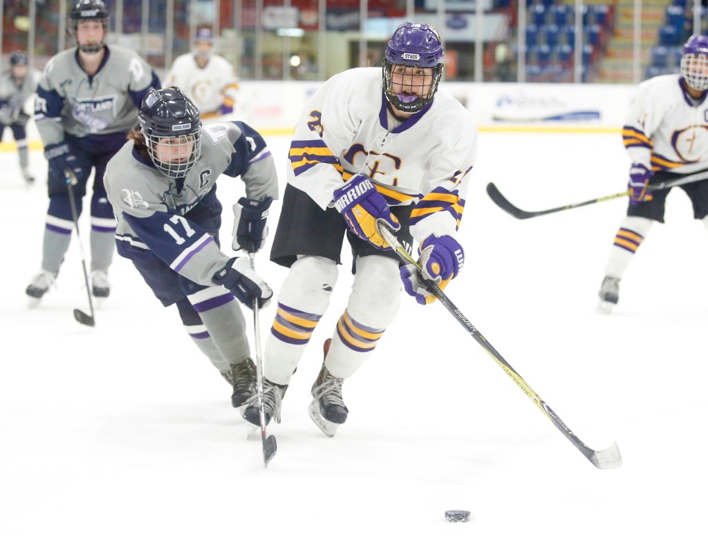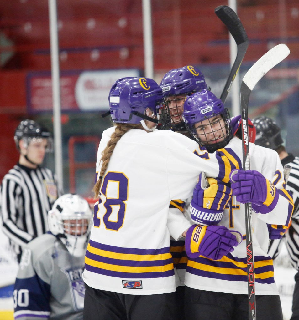 In the third period, McCauley scored from Lamontagne during a scrum at 5:12, Lucia Pompeo added an unassisted goal less than two minutes later and Olivia Adams scored from Caitlin Wolff at 9:52.