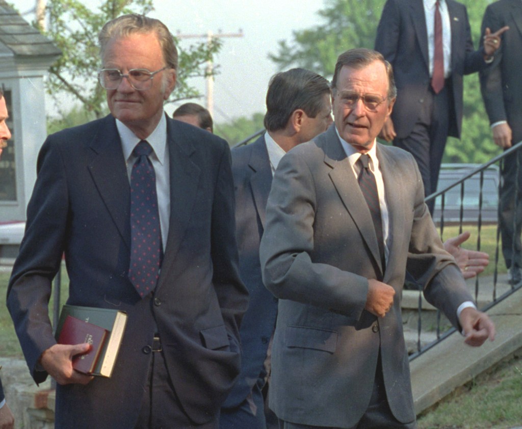 In 1989, he delivered the invocation and benediction at George H.W. Bush’s inauguration. Former president George W. Bush said Graham, while on a visit to the family vacation home in Kennebunkport, Maine, “planted the seeds” of his Christian conversion.