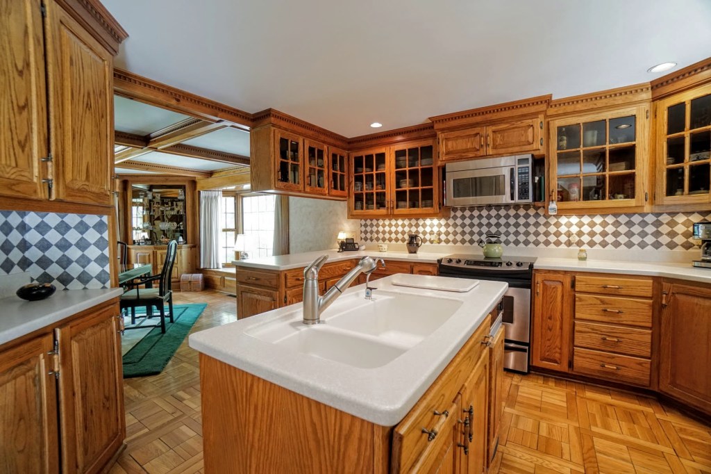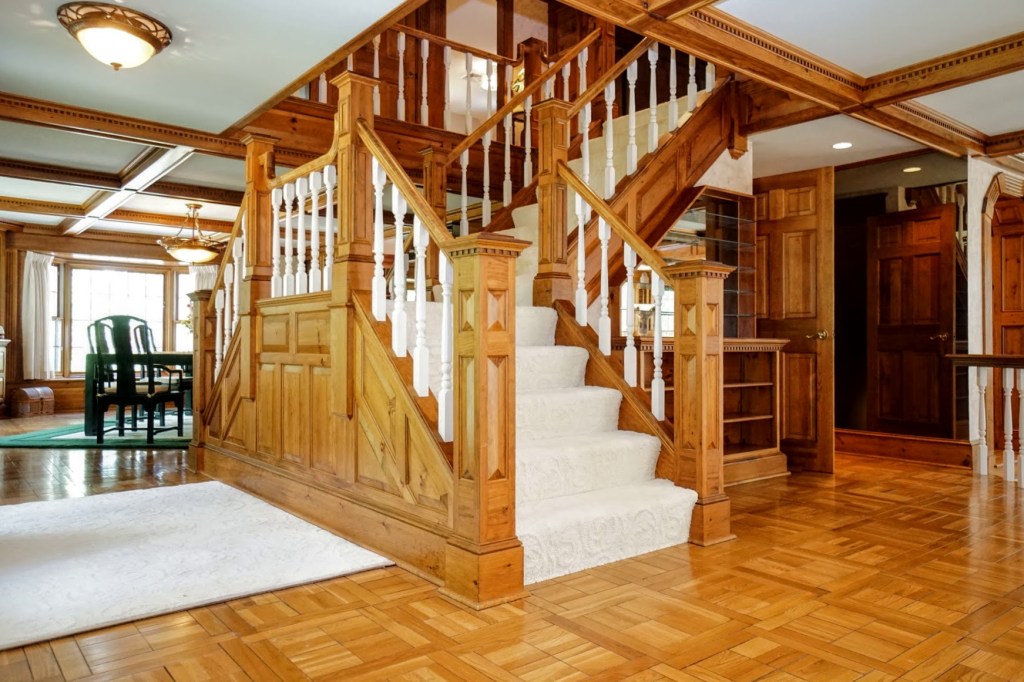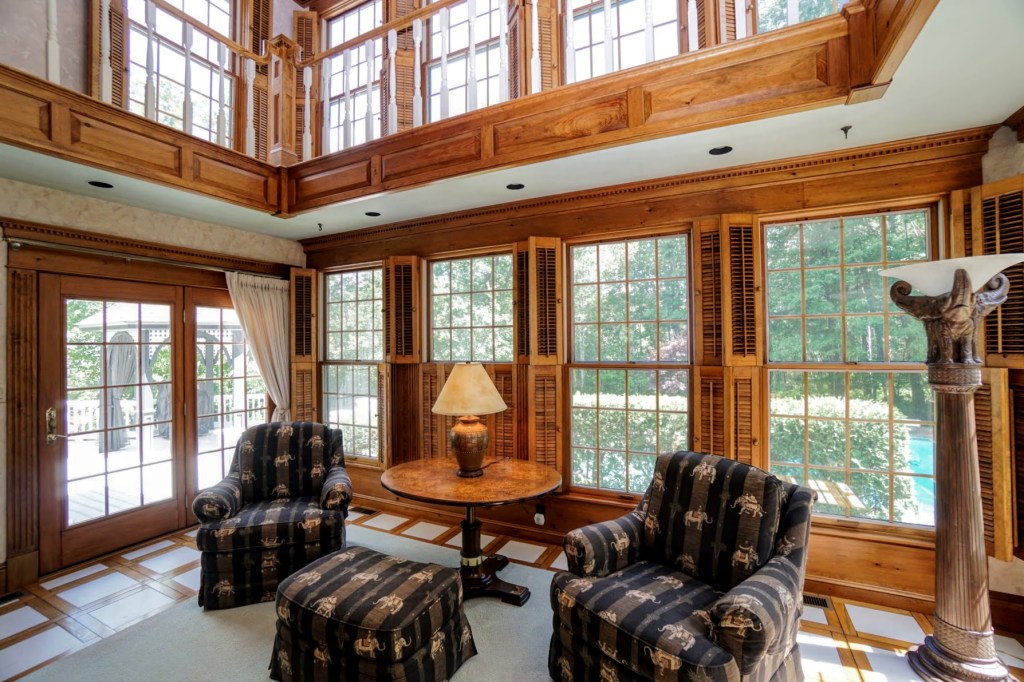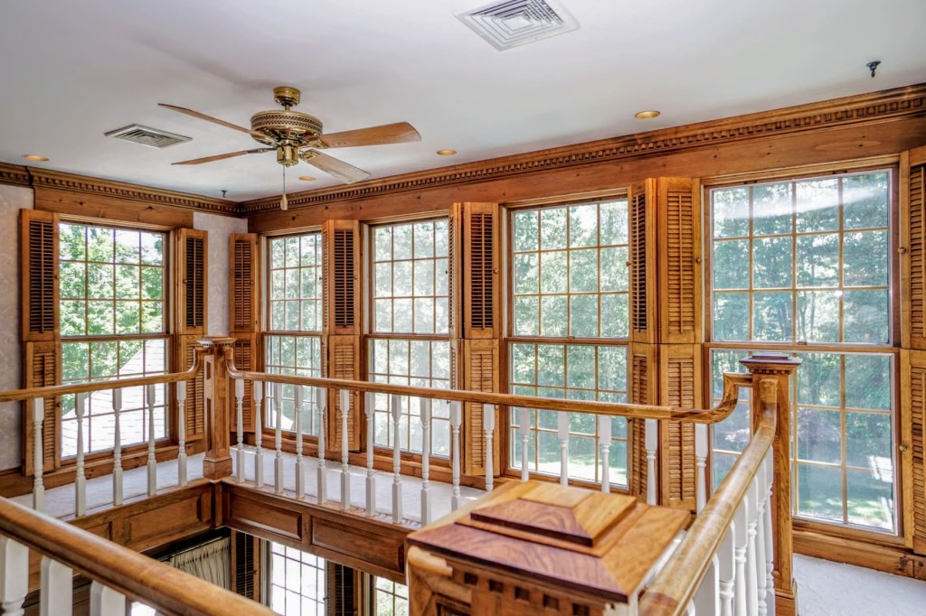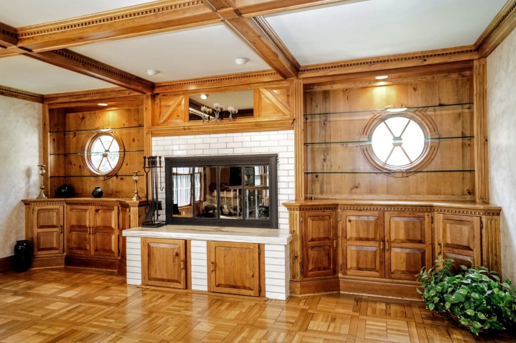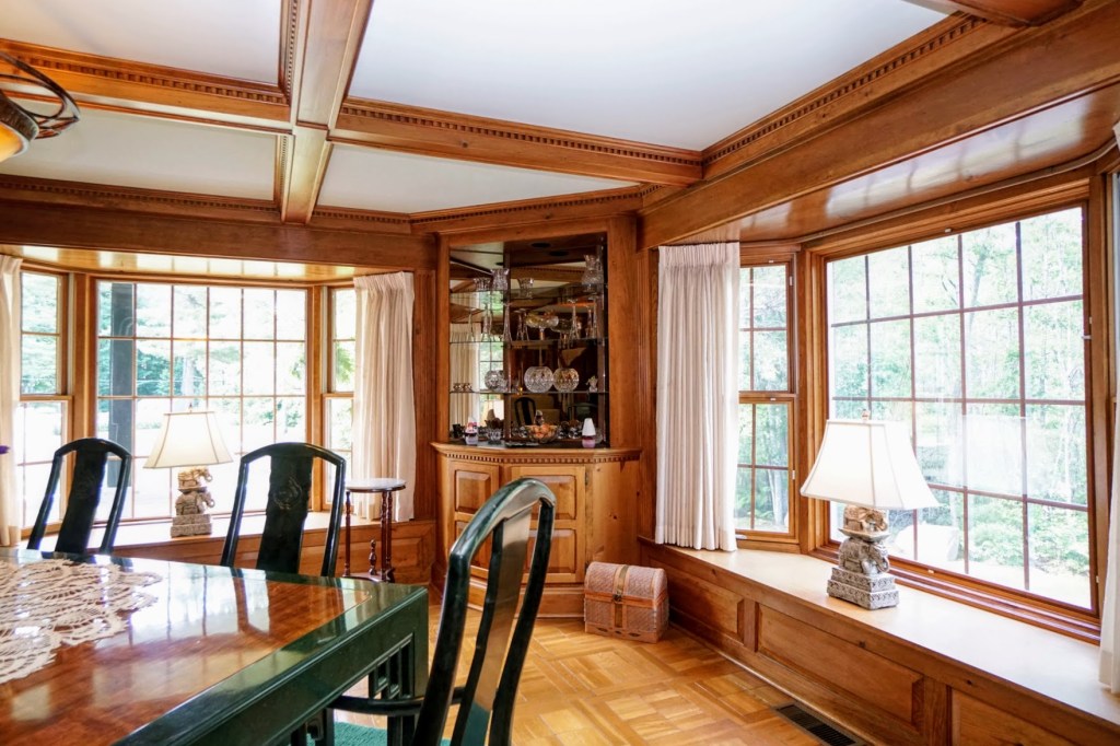 Highlights of the three-bedroom, 2.5-bath home are too numerous to list, but the sunroom’s two-story wall of windows, with balcony, must be mentioned. So must the coffered-ceilinged, parquet-floored living room’s elevated, wood-burning brick fireplace, which is flanked by a wall of gorgeous built-ins. And the combination staircase, rising from both the living room, and the dining room (note its two window bays with seats).