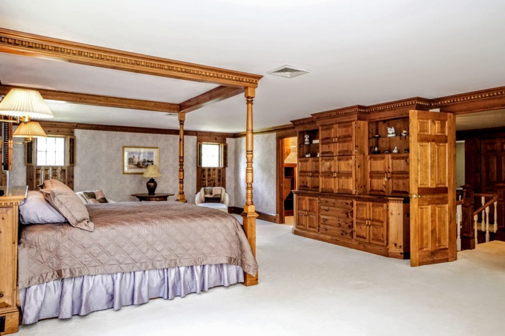 The master suite features marvelous built-ins, and full baths for him and for her. The kitchen’s counters and island-with-sink are Corian, and the stainless appliances are newer. The oven, like the fireplace, can readily be converted to gas. Amenities include central air, central vac, and a security system.