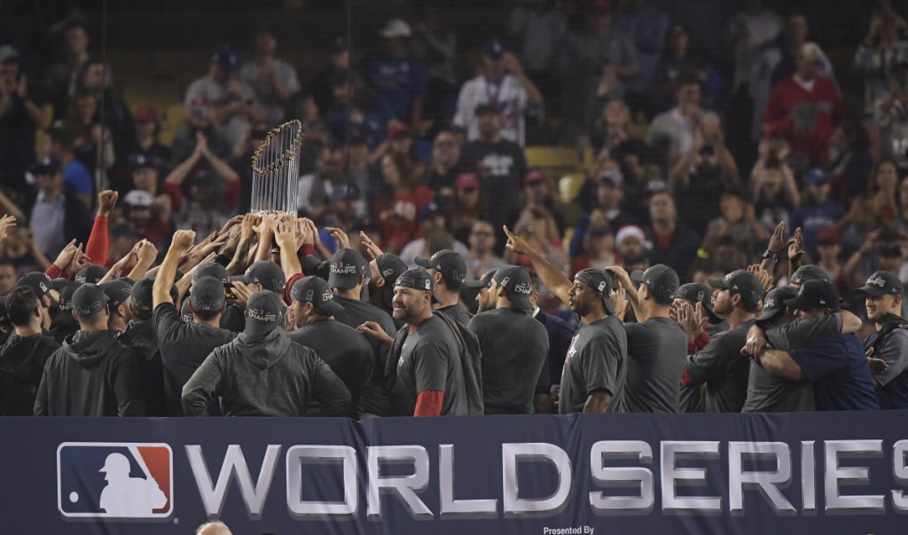 The Boston Red Sox celebrate after winning Game 5 of the World Series over the Dodgers on Sunday in Los Angeles. The Red Sox won 5-1 to win the series 4 games to 1.