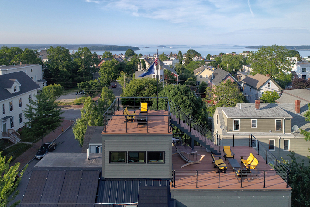 In Portland, on Munjoy Hill’s Monument Street, a sleek and sophisticated new-construction home proved a literal and figurative highlight. The 45-foot topmost of four levels provides panoramic views, and the ultra-refined interior – South American tigerwood floors, gorgeous kitchen, elevator with bar – is near-net-zero efficiency and world-class.