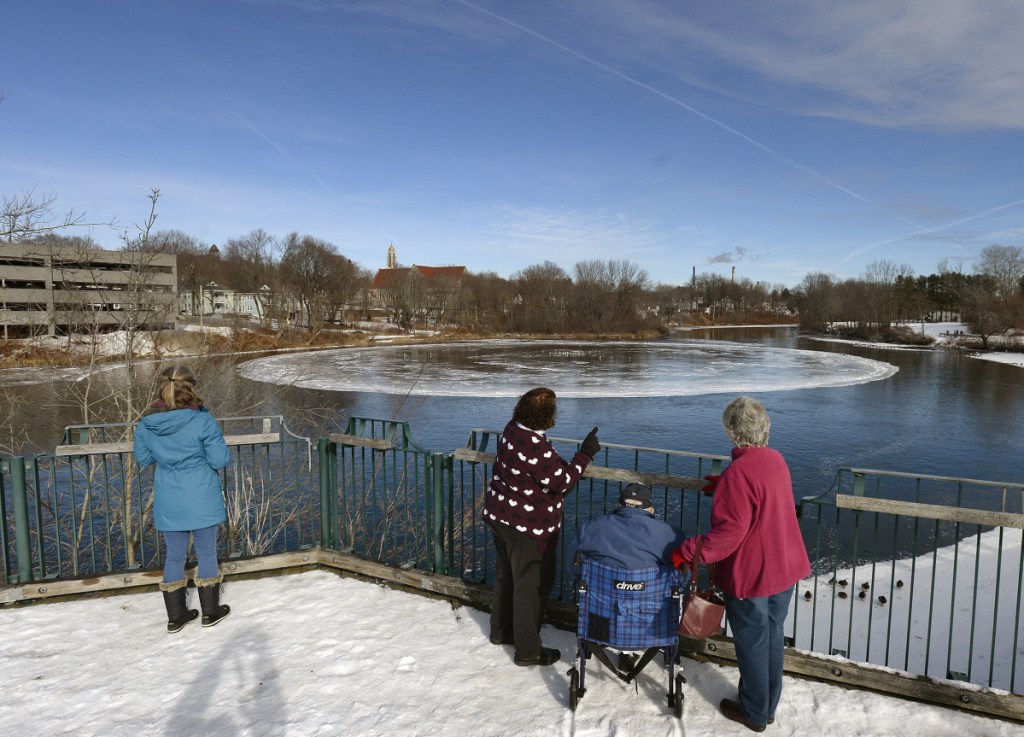 People gather to watch the ice disk after it began rotating again on Thursday. The natural phenomenon has been a boon for businesses in Westbrook, where one bar has named a cocktail the “Ice Disk Cosmo.”