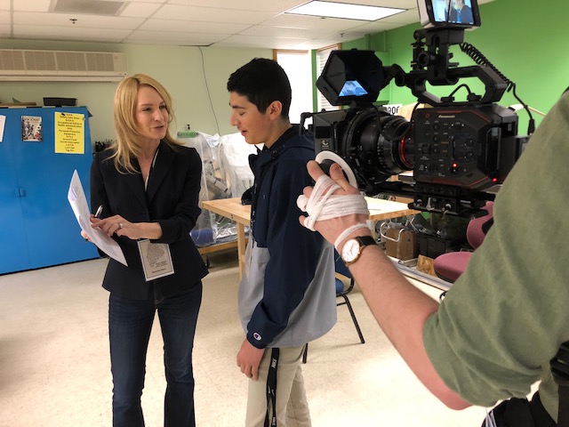 The students practiced being out in the field and delivering news without a teleprompter, which required them to know their subject well. They also tried their hand at hosting “High School Quiz Show: Maine” in front of the camera. Moss, who reminded them to breathe and speak with inflection, pointed out their strong points and coached them on things they could improve. She was energetic and upbeat.