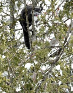 Time kept clicking on, and Bubba, though meowing and howling and shuffling about in the snowy branches, 25 feet up in the tree, didn’t dare to descend.