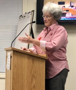 Resident Liz Wisecup speaks during public comment in support of expanding the Smith Cemetery. Jane Vaughan / Lakes Region Weekly