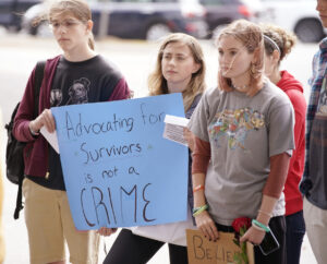One student held a sign that said: “Believe survivors, not perpetrators.” Another said: “Advocating for survivors is not a crime.”
