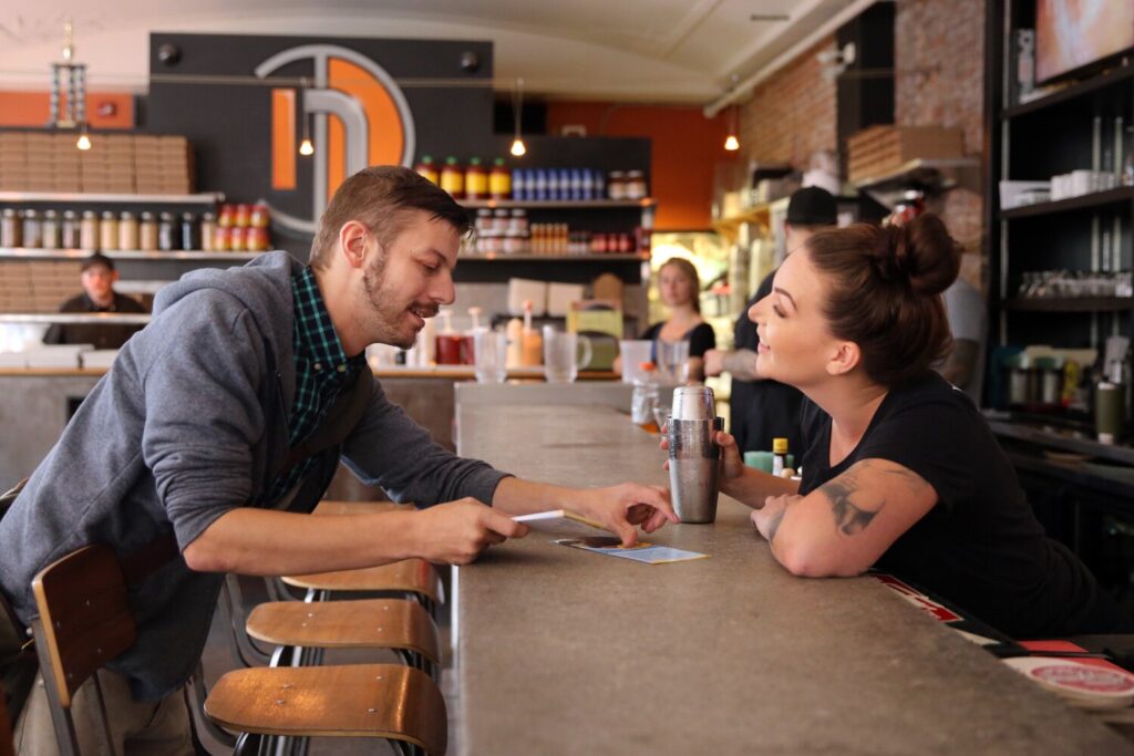 Travis Curran talks about his candidacy for mayor with Elizabeth Gibson, a bartender at Nosh. He says he’s seeking the office because of his everyday experiences as a service worker. Ben McCanna/Staff Photographer