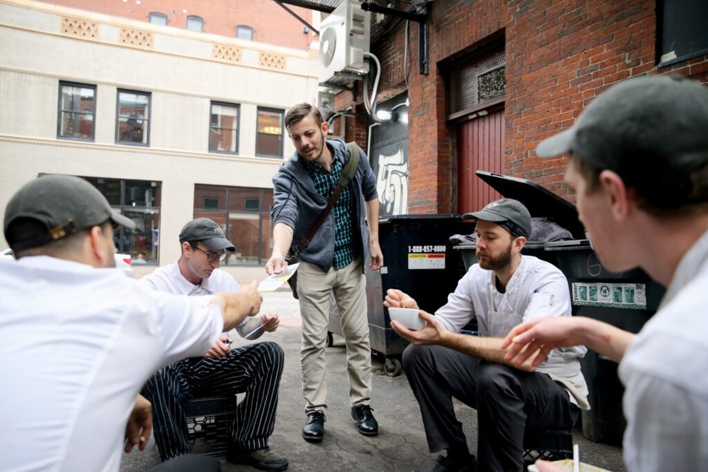 After printing up handbills at the FedEx office and dropping them off at Nosh on Congress Street, Curran spotted a group of kitchen workers seated in a circle on milk crates in an alley behind the Five Fifty-Five restaurant. At first, he didn’t want to interrupt them while they were on break and eating their preshift meal, but ultimately he decided to give it a shot. He walked up to the group and doled out his handbills, which the workers enthusiastically took.
